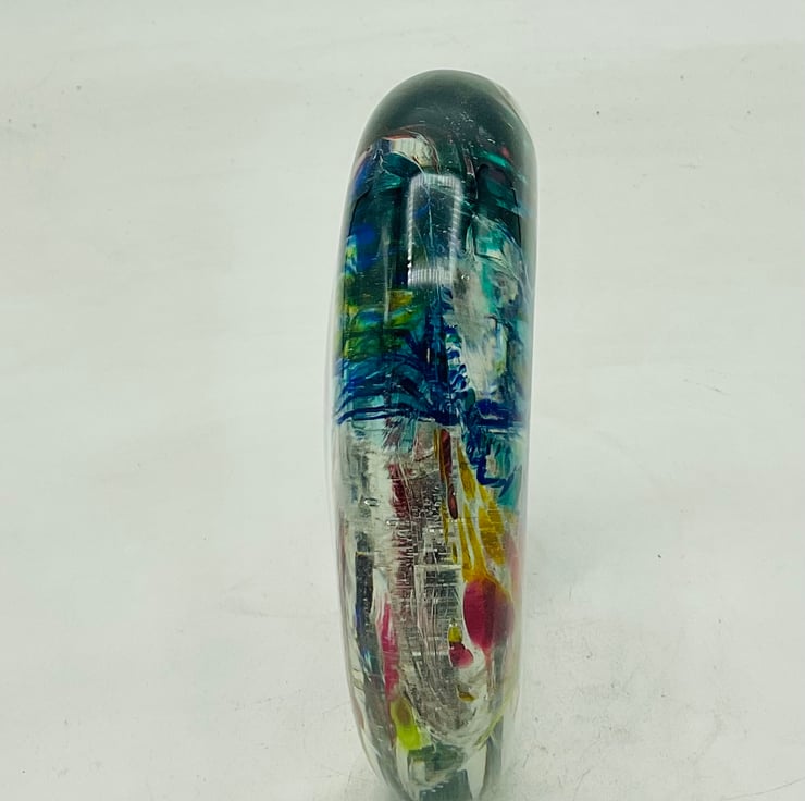 The meaning of cosmos is the universe seen as a well ordered whole. Unlike some of my work which is really exact and precise these are as random as random can be and I love opening up the lehr the following day to see the magic. I have blown lots of bubbles of coloured glass smashed them all up and rolled the molten clear glass across the shards. These pieces are like clouds….the more you look at them the more you see.
