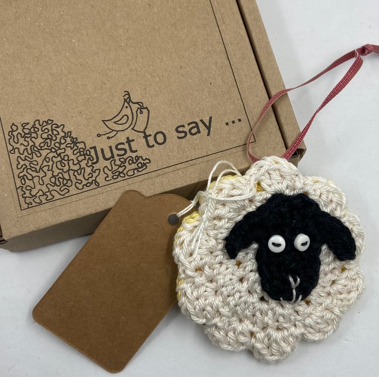 This whimsical double-sided hanging decoration illustrates the saying, 'March, comes in like a lion, goes out like a lamb ' It is crocheted in cotton and the lion and lamb have buttons for eyes. There is a narrow ribbon hanging loop and the tag is printed with the proverb. The lion/lamb measures approximately 7 cm in diameter and comes wrapped in tissue in a labelled PIP ( Postage in Proportion) box all ready to be given or posted on.