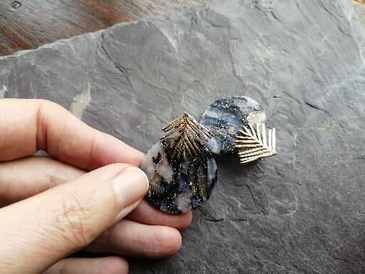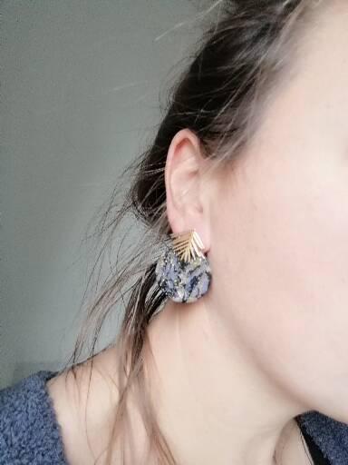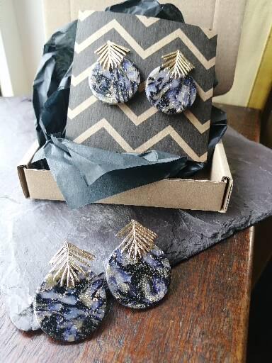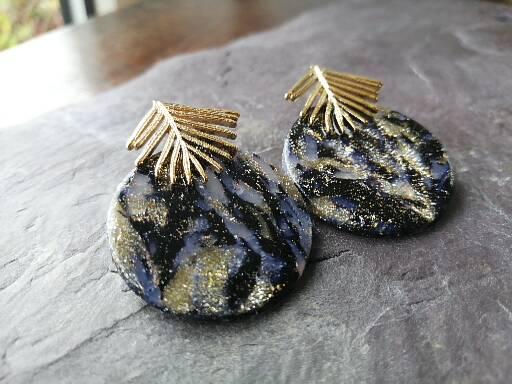 I make these sparkly glam earrings to order. I use lightweight polymer clay to create a marble effect and attach the clay onto a gold-plated hypoallergenic brass fern shaped earring post. The marble effect pattern will be unique to every single earring.