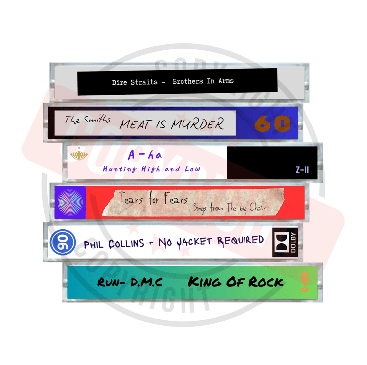 Perfect for music lovers and enthusiasts, this vibrant artwork showcases retro cassette tapes from 1985 in a stylish, modern design. Perfect for a 40th Birthday gift!