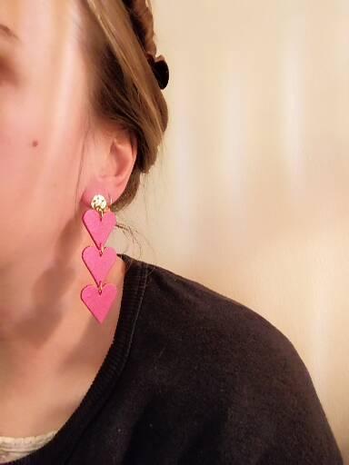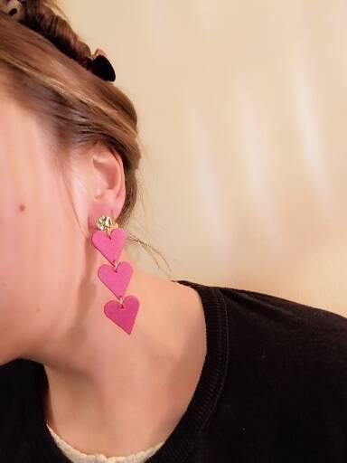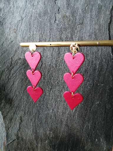 These lovely triple heart drop earrings are made to order. I use lightweight polymer clay to make the hearts. The earring posts are made of gold-plated brass which is hypoallergenic. I hammer the surface of the discs to add some interesting structure and this creates a lovely sparkling gold effect.