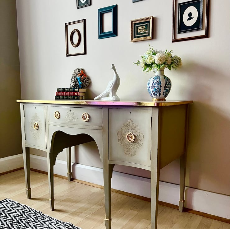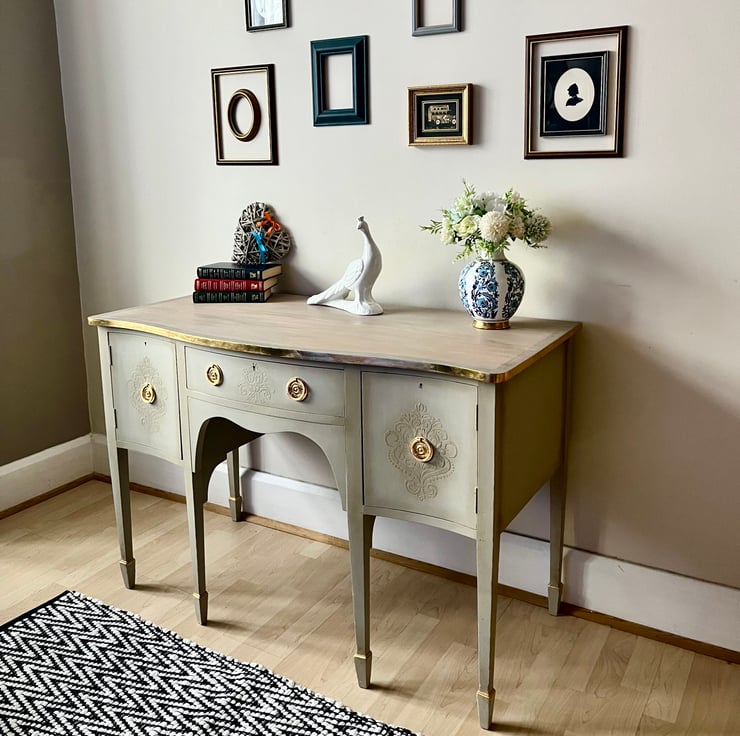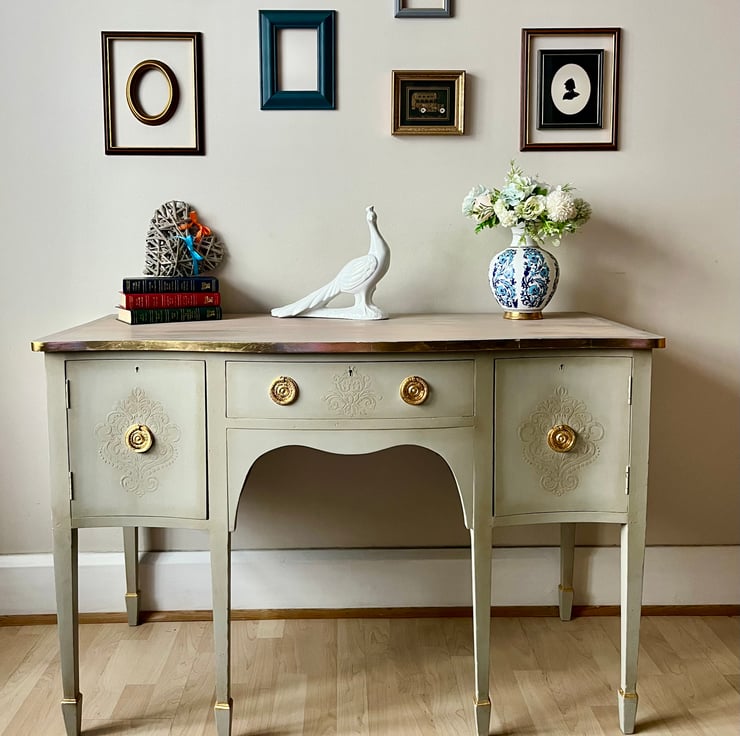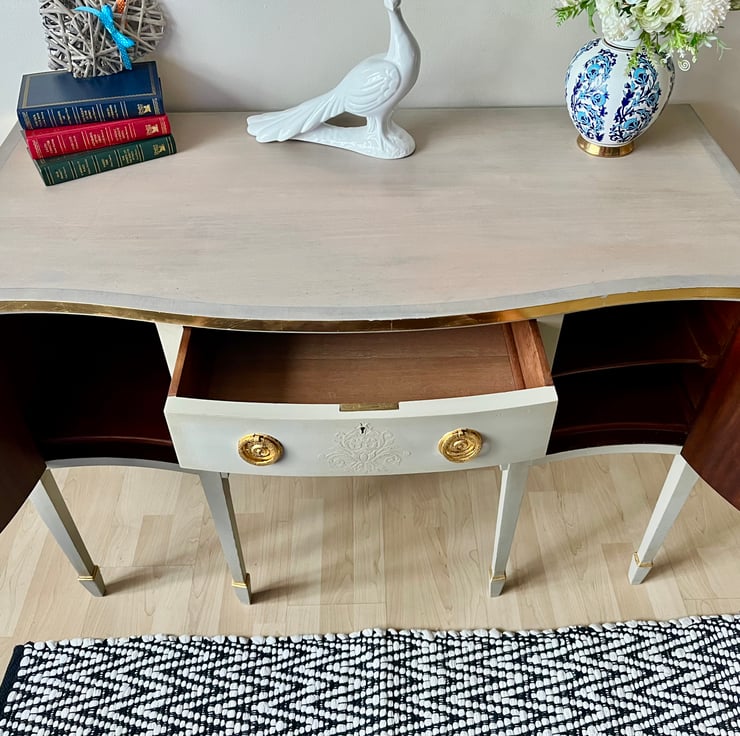 Stunning dressing table painted in Annabell Duke Mineral Paint in light beige colour with clear wax applied for extra protection and dark wax and gold leaf for decoration . The inside has been left original with touch of Danish Oil in Jacobean Dark Oak for refresh. The top has been sanded back , washed paint and clear wax applied for depth of colour and protection.