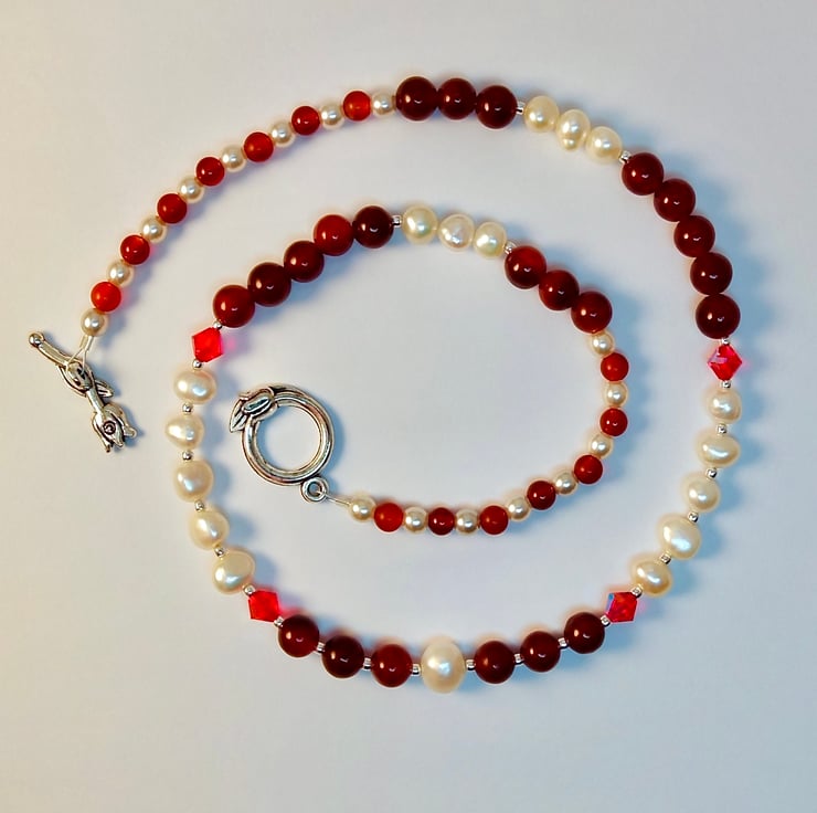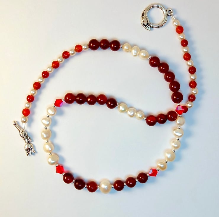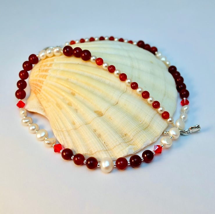 The necklace continues on each side with five Agate beads, three more Pearl and a further trio of Agate beads before graduating to alternating 4mm beads of red Carnelian and Czech glass Pearls.