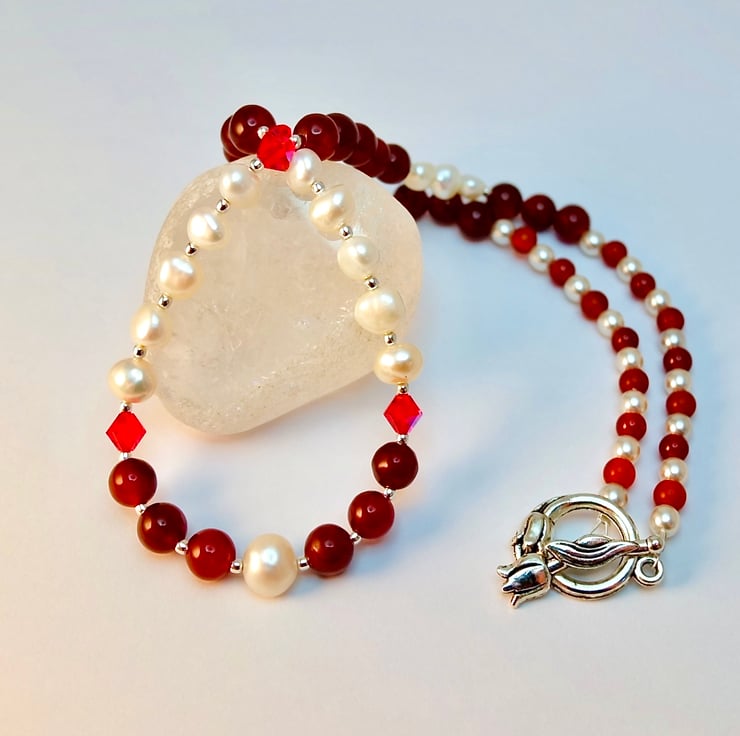 This freshwater Pearl and Agate necklace features a central single freshwater button Pearl that has, to either side, a trio of 6mm red Agate, two 4mm quality Austrian 'scarlet' crystal bicones and a row of five freshwater button Pearls, all separated by tiny 1.8mm sterling silver spacers.