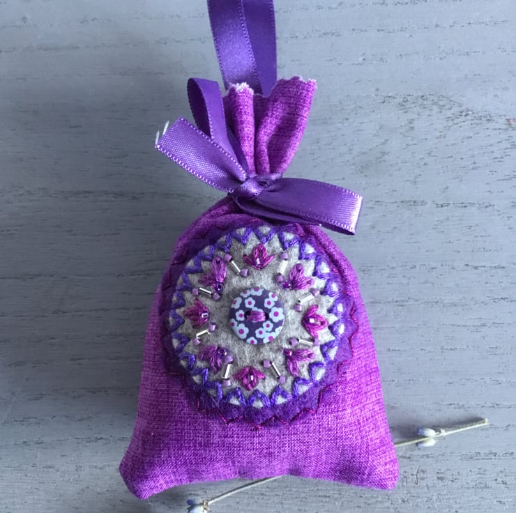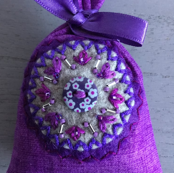This hand embroidery is stitched onto a purple cotton bag, tied with a purple satin bow and a long hanging loop. This bag is filled with lovely fragrant Lavender, grown in my Yorkshire garden……give the bag a scrunch and the beautiful Lavender fragrance spills out…..into the home….