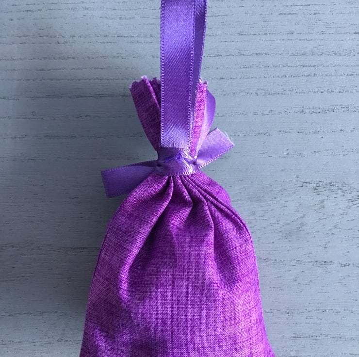 This Lavender Bag is 4 x3 inches (11 x 7 cms ) in size. Its long ribbon loop is ready to hang on a coat hanger, over a picture frame, a cupboard handle or to put in with clothes.