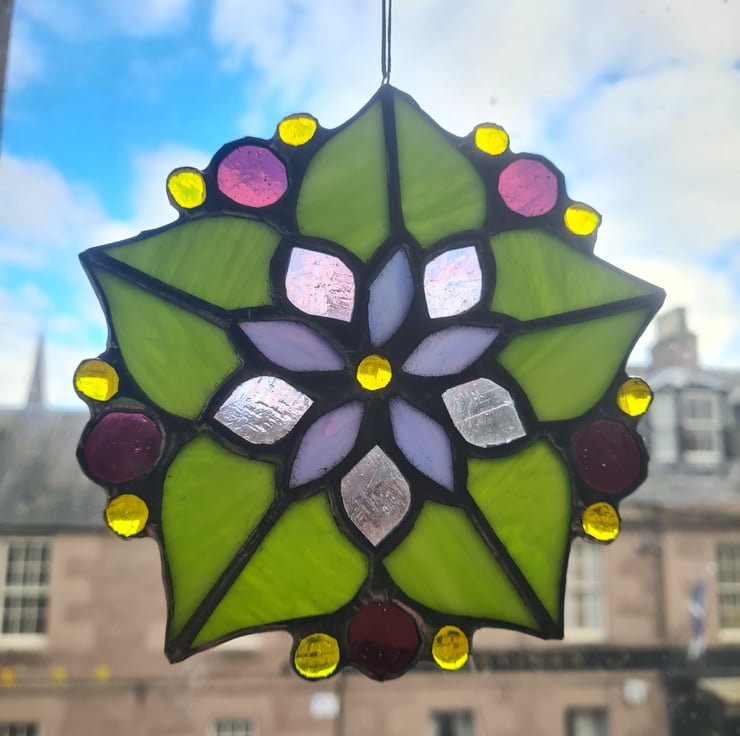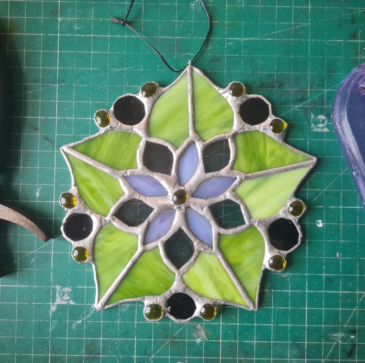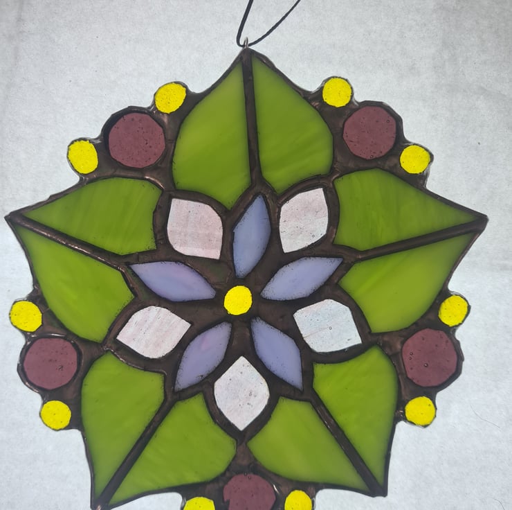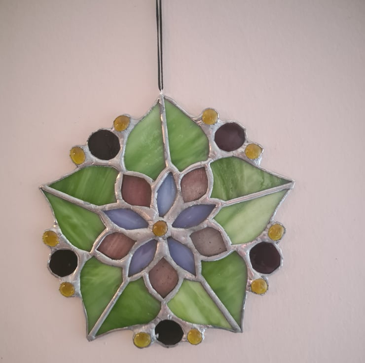 This piece came about after experimenting with more organic shapes and placement. Inspired by flora and fauna this piece measures approximately 15x15cm. It is hand crafted using the Tiffany method, it is delicate to look at but made to last and will enchant you for years to come!