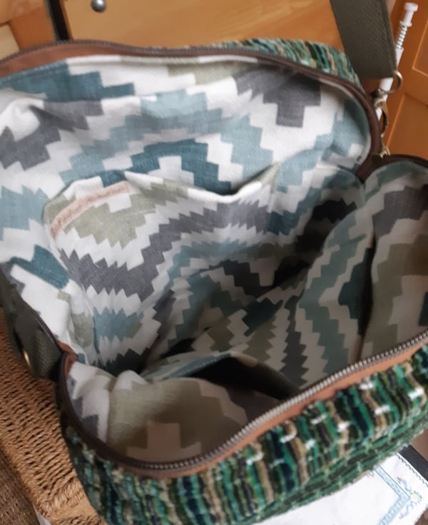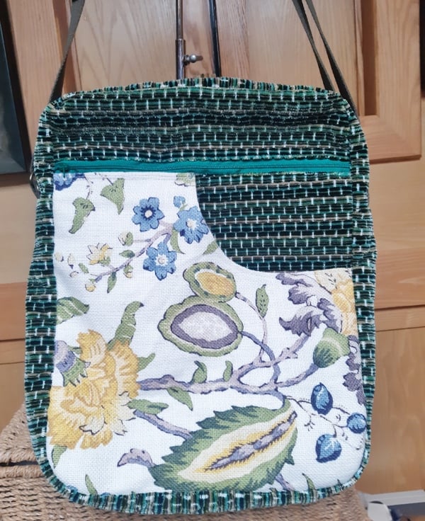 Large chenille crossbody bag in shades of green with a printed linen weave front pocket. Additional zipped front pocket, zipped main compartment lined in another printed linen weave with inside pockets and adjustable cotton webbing strap. This bag will comfortably take a laptop and an A4 ring binder.