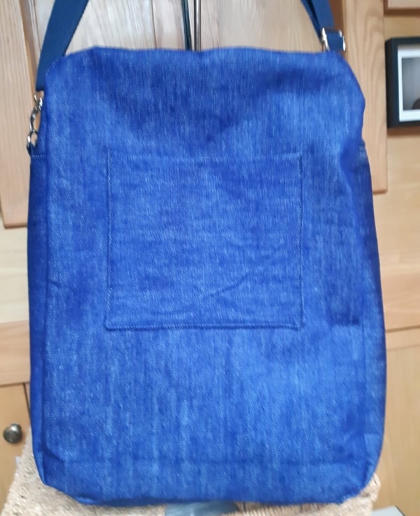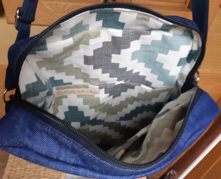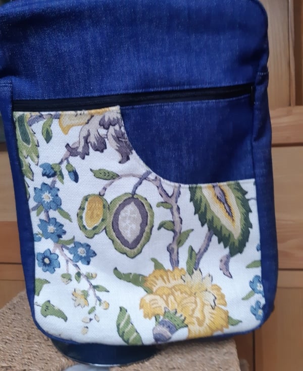 Large crossbody bag in blue denim, with printed floral linen weave front pocket and patch pocket on the back. Additional zipped front pocket, zipped main compartment lined in geometric linen weave with inside pockets and adjustable cotton webbing strap. This bag will easily take a laptop and an A4 ring binder.