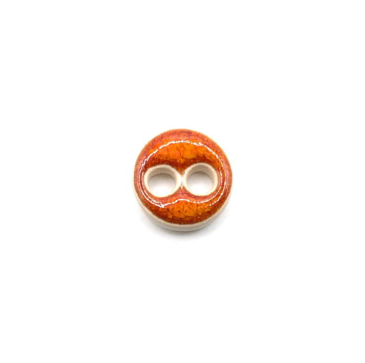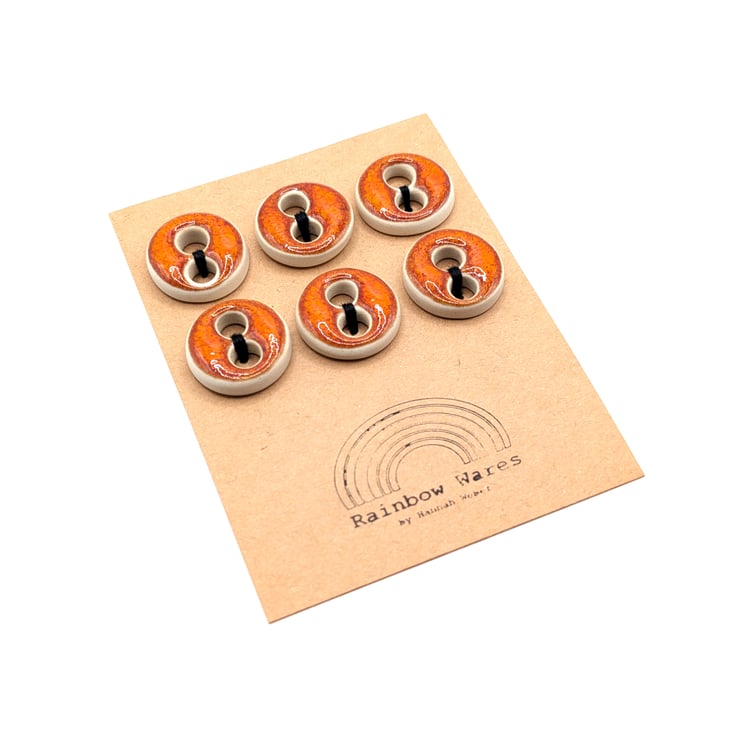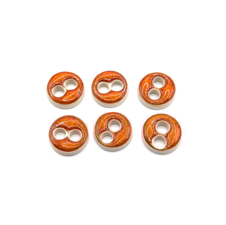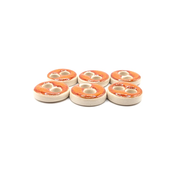 Set of 6 small round handmade ceramic buttons decorated with fiery orange effect glaze and made from a white stoneware clay. Ideal to complete your knitting, crochet, sewing or other unique craft project!