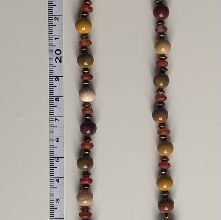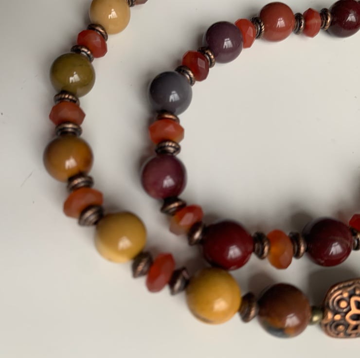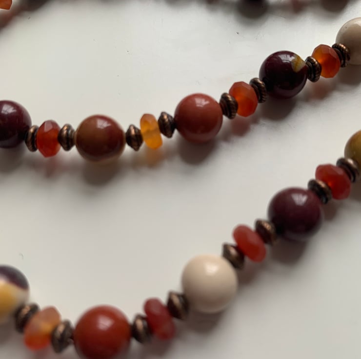 This beautiful longline necklace is made from a beautiful array of Jasper beads in the colours of a red hot sunset, punctuated with frosted carnelian rondelles and warm copper spacers. This necklace hangs at approximately 38cm