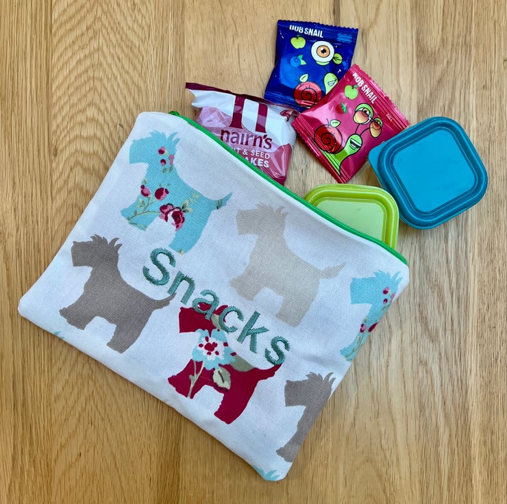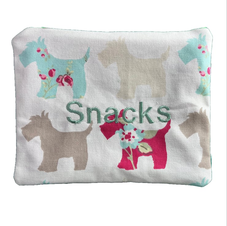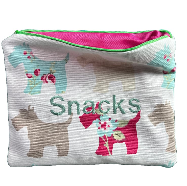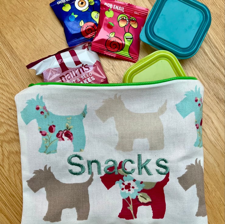 Snacks not included! Looking for help getting organised or a useful, original gift? Meet one of my Get Sorted Bags. This cute Scottie dog design snack bag has been lovingly handmade and embroidered by me to reduce a little bit of stress! If you have/know a child or adult who needs a snack on hand at all times this could be the gift for you. Big enough to hold a few essential snacks and to keep stocked and ready in a school, sports or handbag. The Scottie snack bag measures 21cm x 17cm, has a green zip closure, is lined with a fun bright pink satin and embroidered with ‘Snacks’ to make it easy to identify. I keep one ready and topped up at all times. It saves a last minute dash when we are leaving the house! Suitable for packaged food items only.