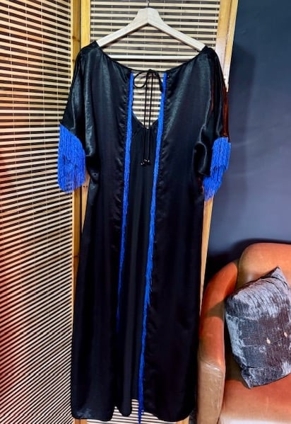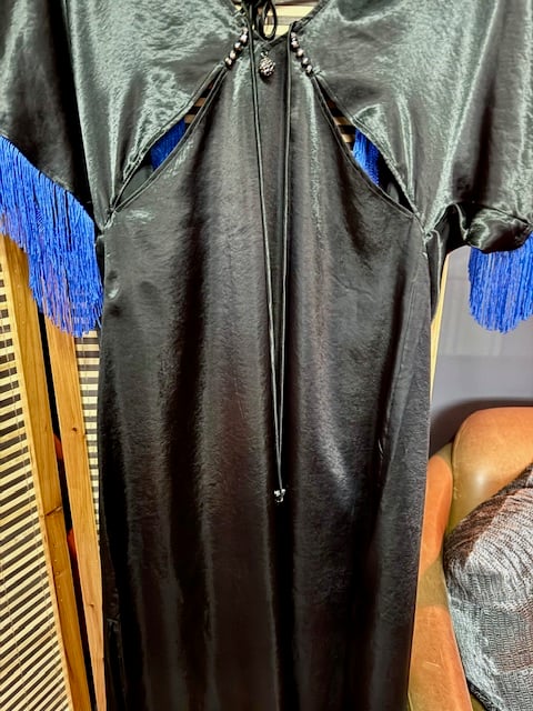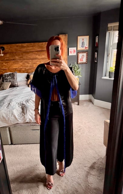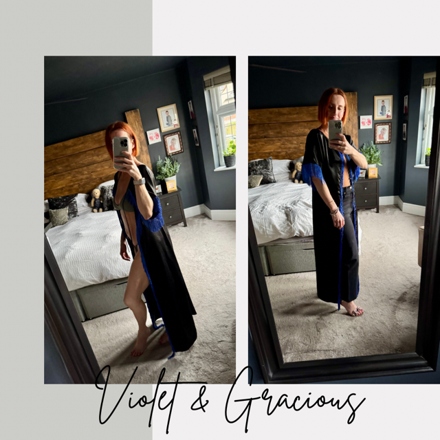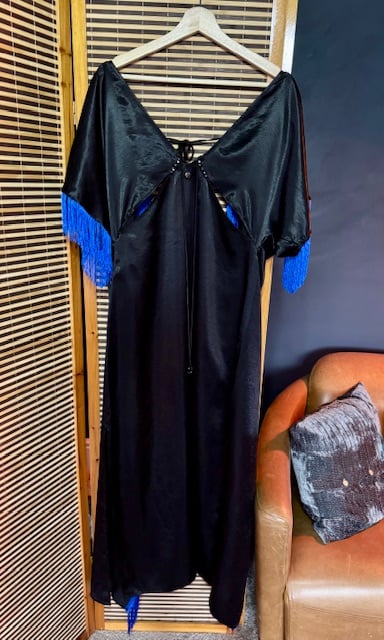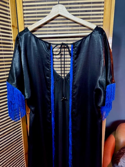 This beautiful cover up has vintage style vibes featuring tassels in beautiful, bright blue. Perfect for adding touch of elegance to your outfit for a night out or throw over your swimwear for sunset cocktails on holiday.