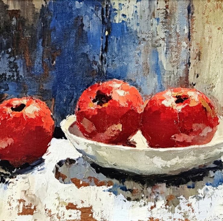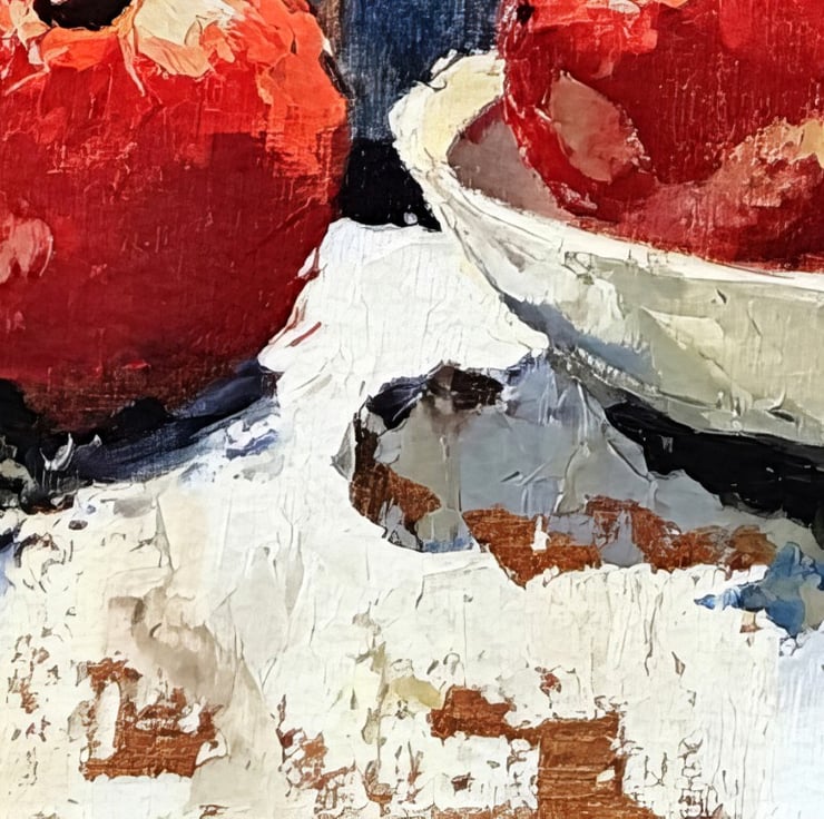 This rustic still life painting captures the raw beauty of everyday objects with expressive brushstrokes and rich texture. The deep red pomegranates, set against a weathered wooden backdrop, create a striking contrast that enhances the visual depth. The rustic charm of the background adds character, making the artwork feel warm and inviting.