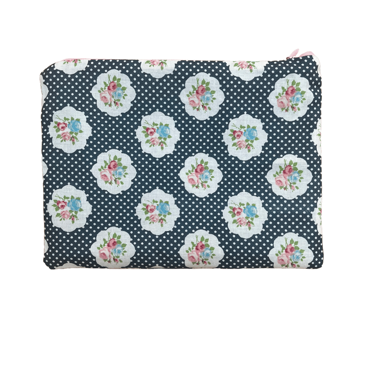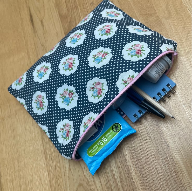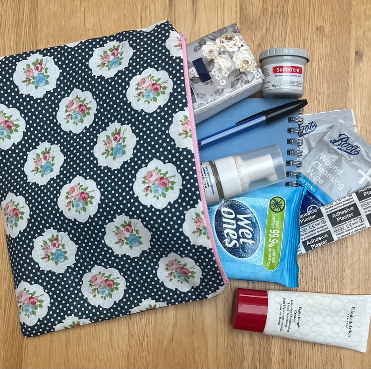 Meet a bag essential (contents not included!). One of my Get Sorted Bags range, this cute blue spotty flower design bag measures 22.5cm x 17cm (approx). It is fully lined in a coordinating blue spotty fabric and has a pink zip fastening. Suitable for lots of uses but I like to keep one on hand with some, get me out of trouble, essentials. For a small bag you can fit in a fair few things! Could also be used as a pencil case, snack bags, cosmetic bag. As with all my designs this bag has been lovingly designed and handmade by me and no one else will ever have exactly the same item! I do have a larger co-ordinating bag in this fabric available if you are looking for a matching set or larger version.