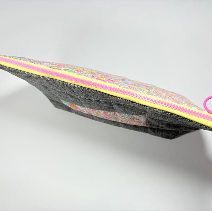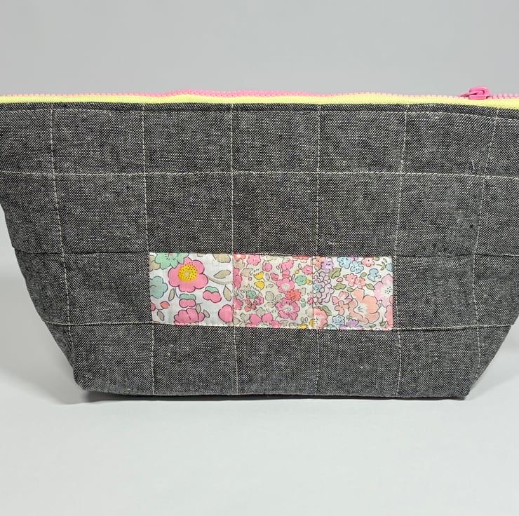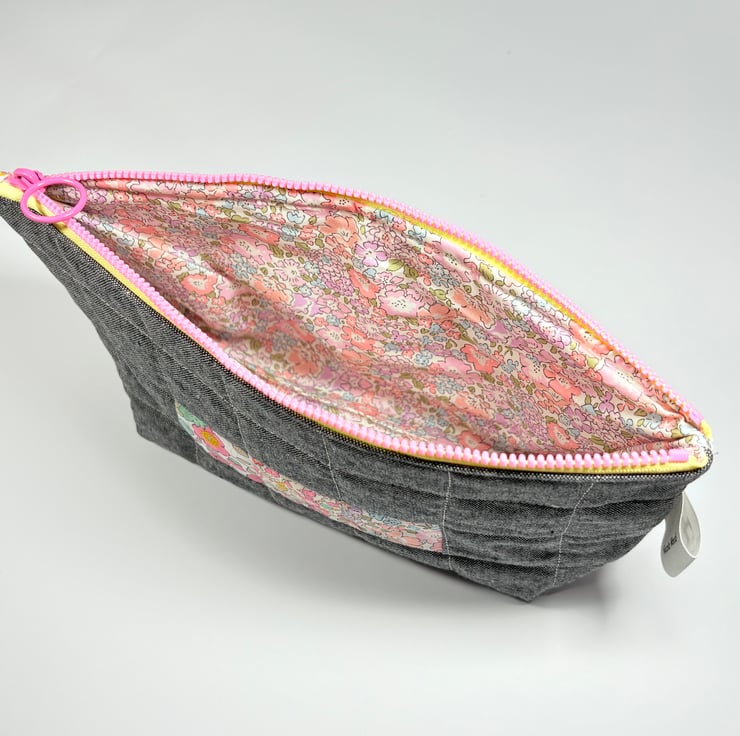 It is slightly padded, and has been quilted to give a lovely soft feel and to protect precious contents. It has a pink Liberty Tana lawn lining which contrasts beautifully with the patchwork exterior. The back of the pouch has a three patch accent on charcoal linen, quilted to match the front. The pouch is finished with a pretty yellow and pink zipper with large ring pull.