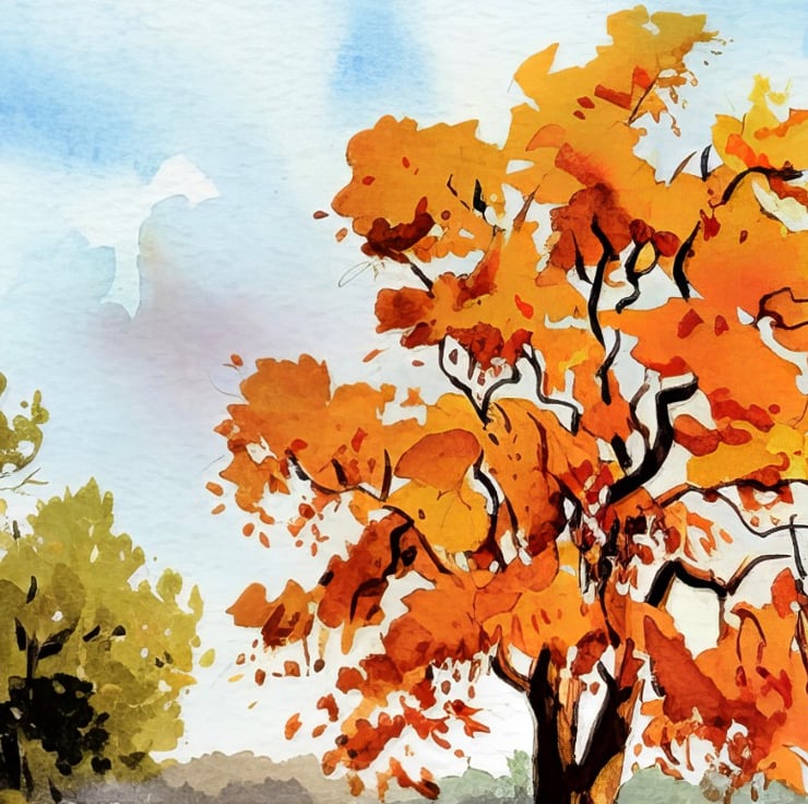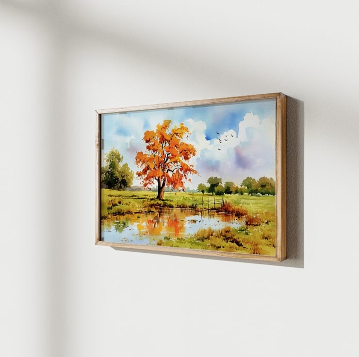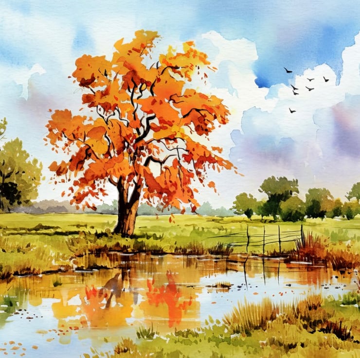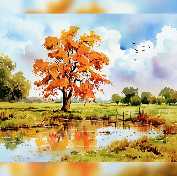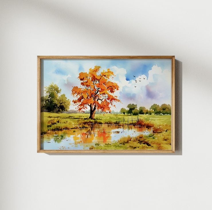 This autumn reflection painting beautifully captures the essence of fall with its rich colors and tranquil setting. A striking tree with brilliant orange leaves stands tall, its reflection shimmering in the calm pond below. The vibrant hues contrast against the soft greens of the landscape, creating a dynamic yet peaceful composition.
