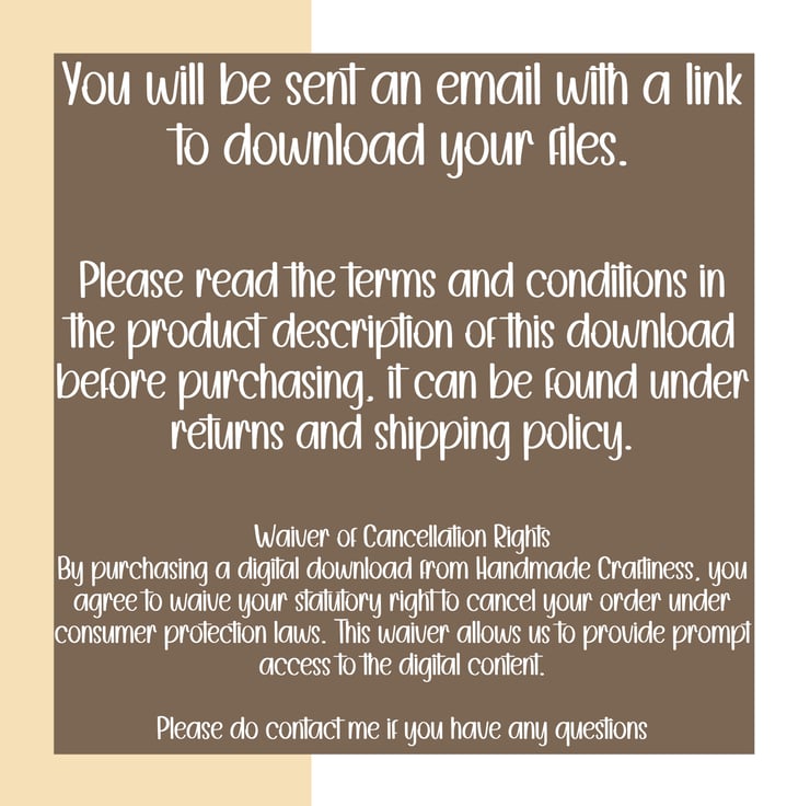 No Refunds for Digital Downloads Refund Policy for Digital Downloads Acceptance of Terms By completing your purchase, you acknowledge and accept this refund policy. At Handmade Craftiness, we are committed to providing high-quality digital products. Please read our refund policy carefully before making a purchase: Waiver of Cancellation Rights By purchasing a digital download from Handmade Craftiness, you agree to waive your statutory right to cancel your order under consumer protection laws. This waiver allows us to provide prompt access to the digital content. No Refunds After Download For digital downloads, consumers are required to waive their cancellation rights before the digital content can be provided. This means that once a customer (i.e., the consumer) has downloaded the content, they have given up their consumer rights to a refund. This policy aligns with consumer law for digital goods, ensuring the protection of intellectual property and preventing unauthorized distribution. Cancelling a Digital Download Under the Consumer Contracts Regulations 2013, digital downloads are neither goods nor services, meaning the law is a little different. If you want to download something within 14 days of buying it (known as the 'cooling-off’ period), you must give your consent to waive the 14-day cooling-off period. If you do not give your consent, the 14-day cooling-off period still applies. However, you will not be able to download your digital content until this period has ended. This policy exists to prevent customers from changing their minds after downloading the content. As you are being sent a link via email to download after purchase this will count as downloading the content as you will have access to download the files from the email. Eligibility for Refunds Refunds may only be issued under exceptional circumstances, such as: The digital content is proven to be defective or incomplete. An error on our part (e.g., duplicate billing). Contact Us If you believe you are eligible for a refund due to one of the exceptional circumstances above, please contact us at orders@handmadecraftiness.co.uk with your order details, a description of the issue, and proof of purchase. Our team will review your request and respond within 7 business days. For further inquiries, please contact us at orders@handmadecraftiness.co.uk. ------------------------------------------------------------------------------------------------------------------------------------------------------------- Ownership and Usage: All artwork within this shop is the exclusive property of Handmadecraftiness. You are expressly prohibited from reproducing, altering, redistributing, reselling, or claiming ownership of any digital item from this store. However, you are permitted to incorporate products from this store into your own physical handmade items for sale as a hobbyist. TERMS OF USE 1. You may print and use these items in a tangible journal/scrapbook/craft project etc. 2. You MAY NOT sell or share these files. 3. You MAY NOT reproduce/alter/redistribute our designs as a digital or physical item. 4. You MAY NOT sell or manipulate these files for resale purposes. 5. You MAY NOT share these files individually or as kits.