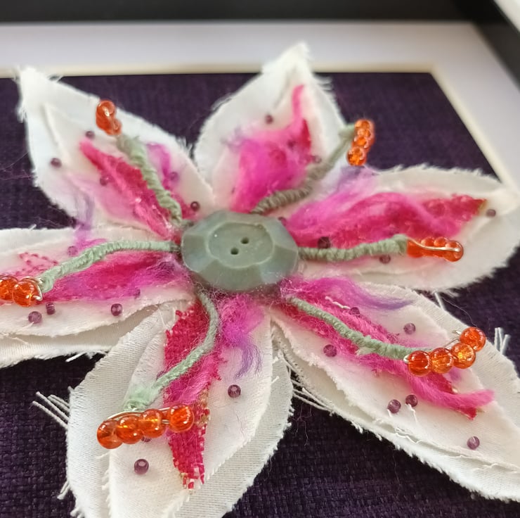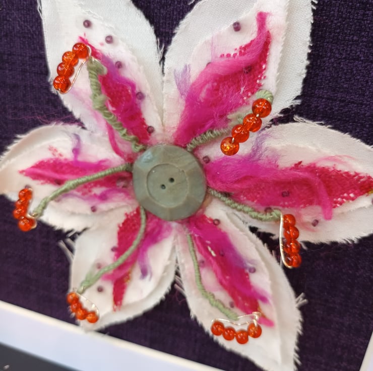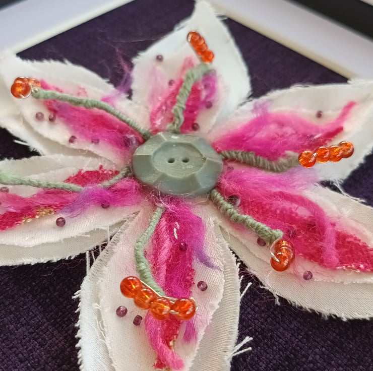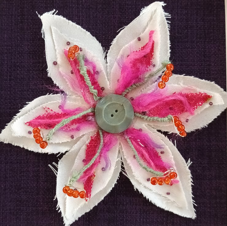 The stamen are tiny beads threaded on to the wire from an old spiral notebook, a spare button at the centre and remnant fabrics for the petals.