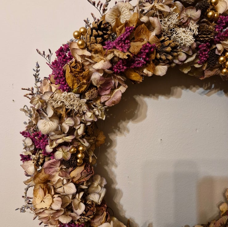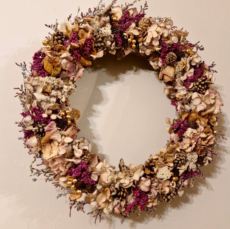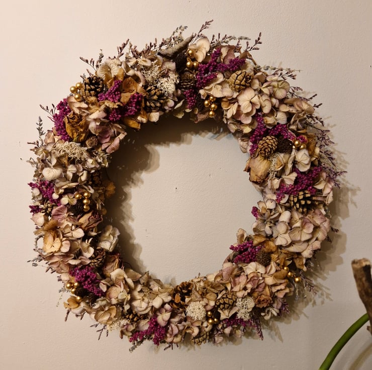 A very large Dried Flower Wreath handmade by myself using mainly Hydrangea Florets & accents of Lavender, Reindeer Moss & Pine Cones. Complete with hanging loop for easy hanging. Size 45cm across. Any questions please feel free to ask.