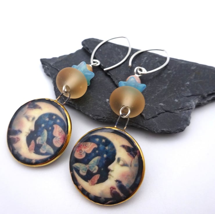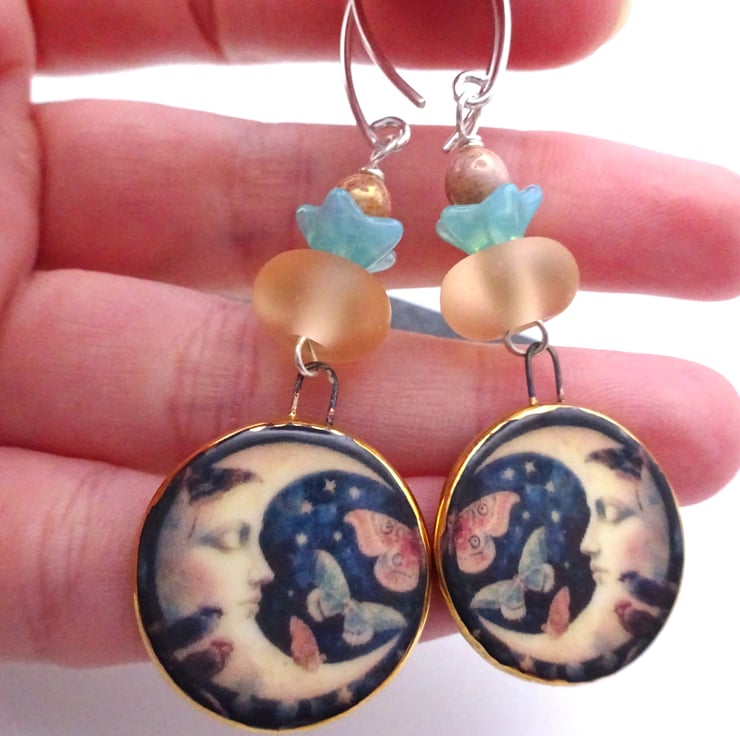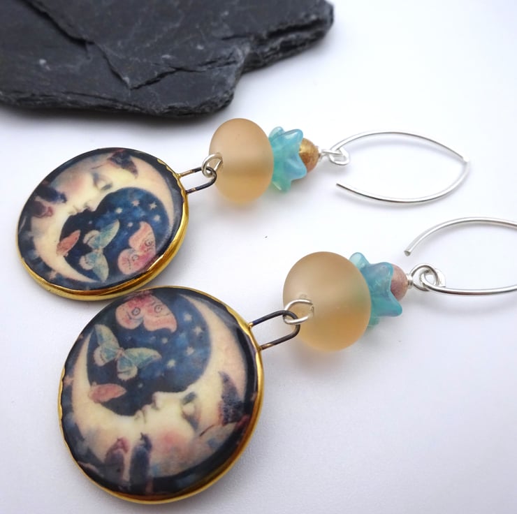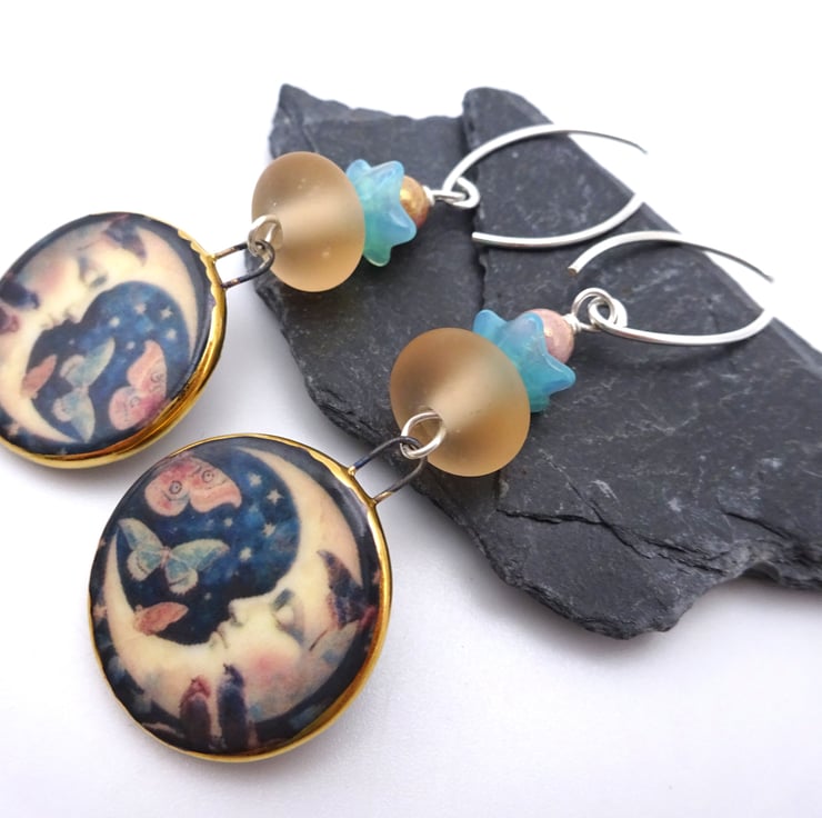 A pair of earrings made with sterling silver ear wires, Czech glass beads, handmade lampwork peach frosted glass beads and handmade ceramic moon charms.
