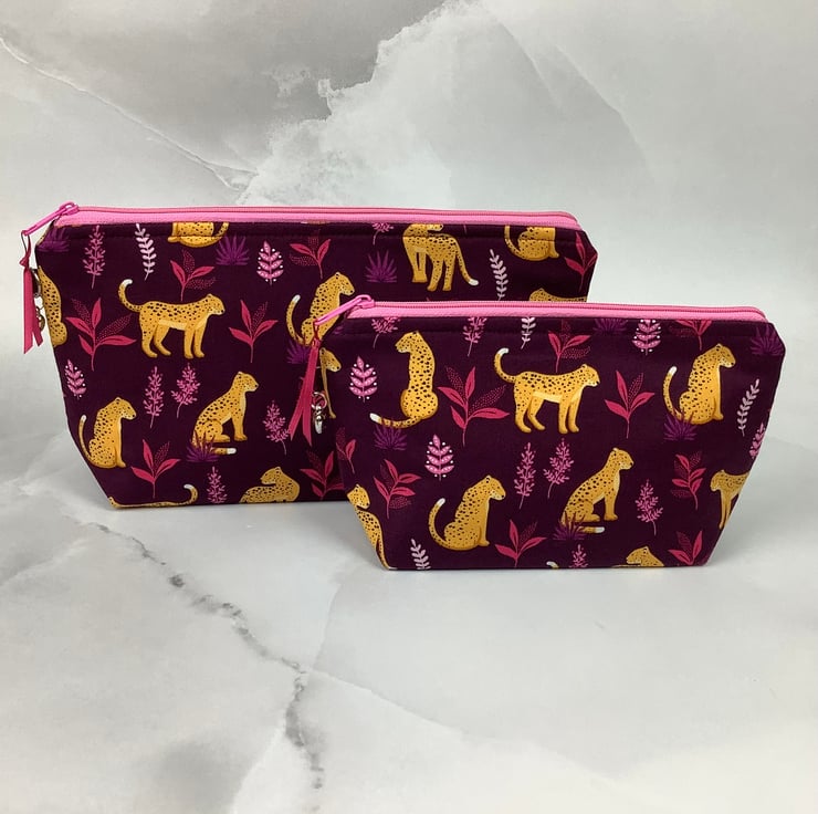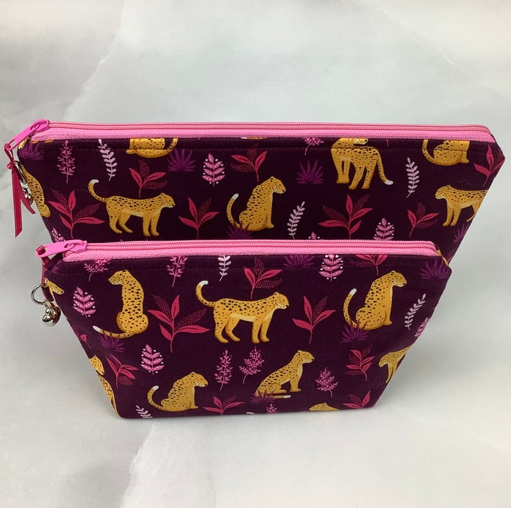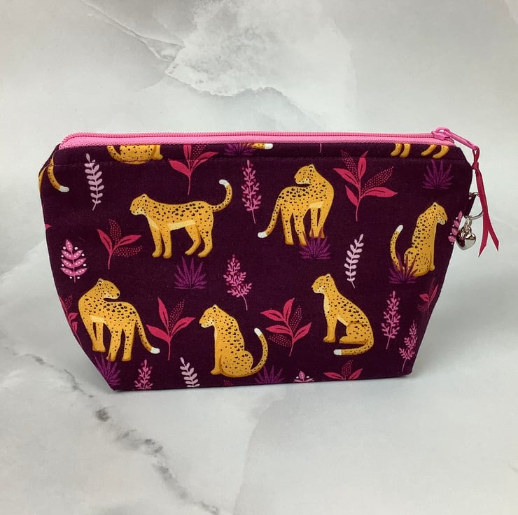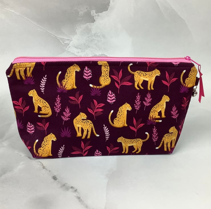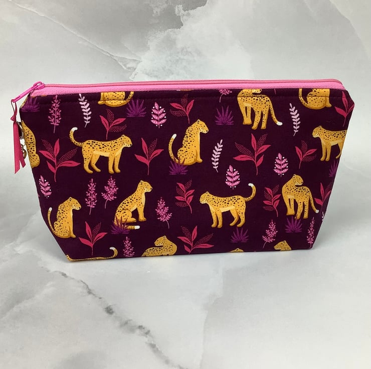 Handmade flat bottomed zip bag in a fun cats cotton fabric and lined in a rich pink cotton.