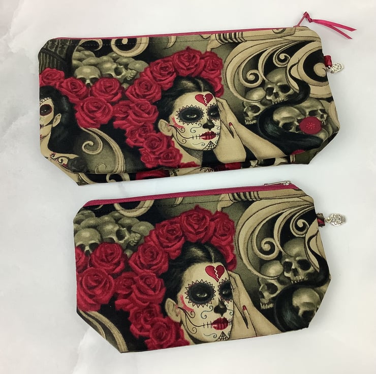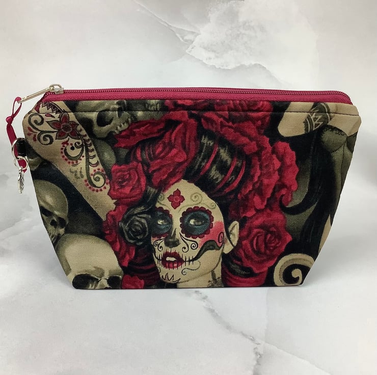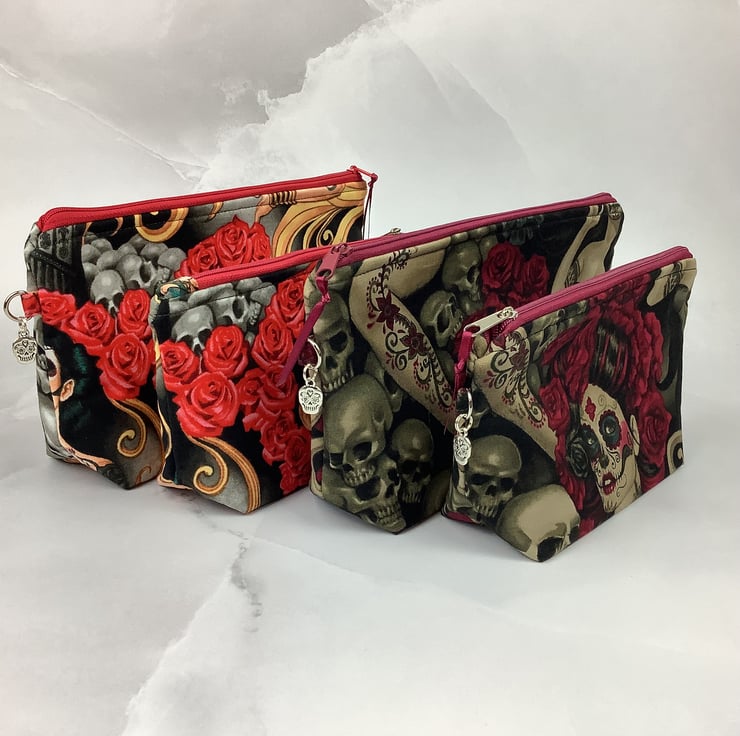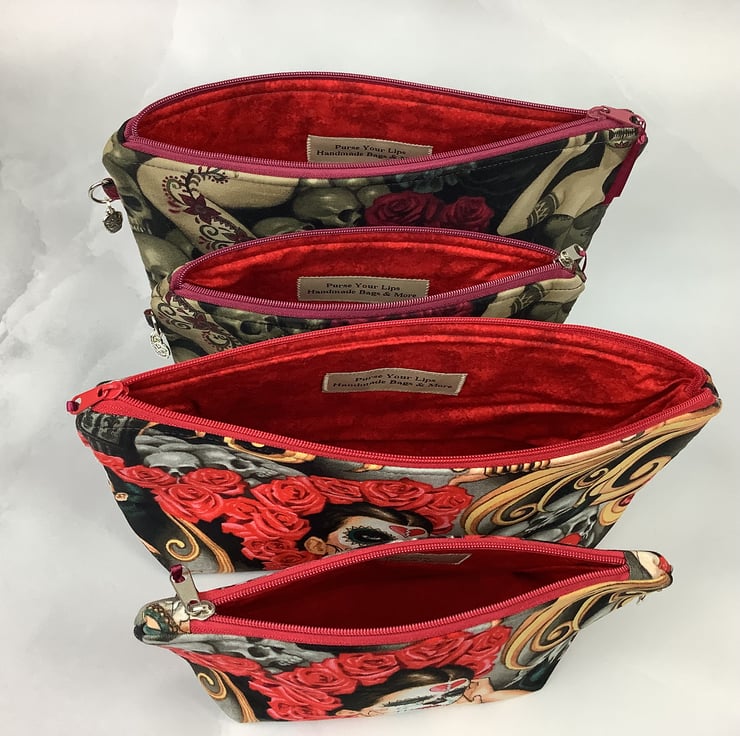 Handmade flat bottomed zip bag in a stunning gothic inspired cotton fabric in a choice of colours and available in 2 sizes.