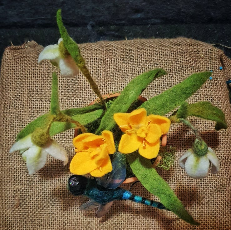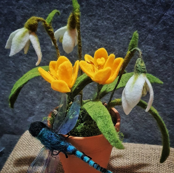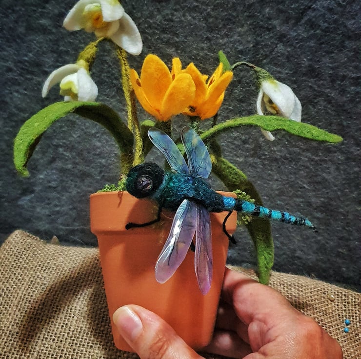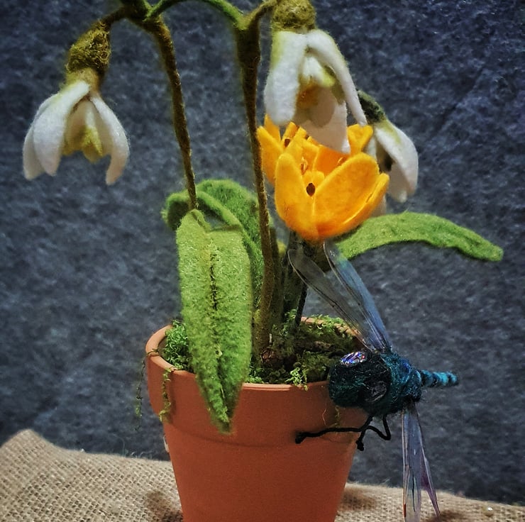 Needle felted Dragonfly perched on a terracotta pot full of snowdrops and crocus