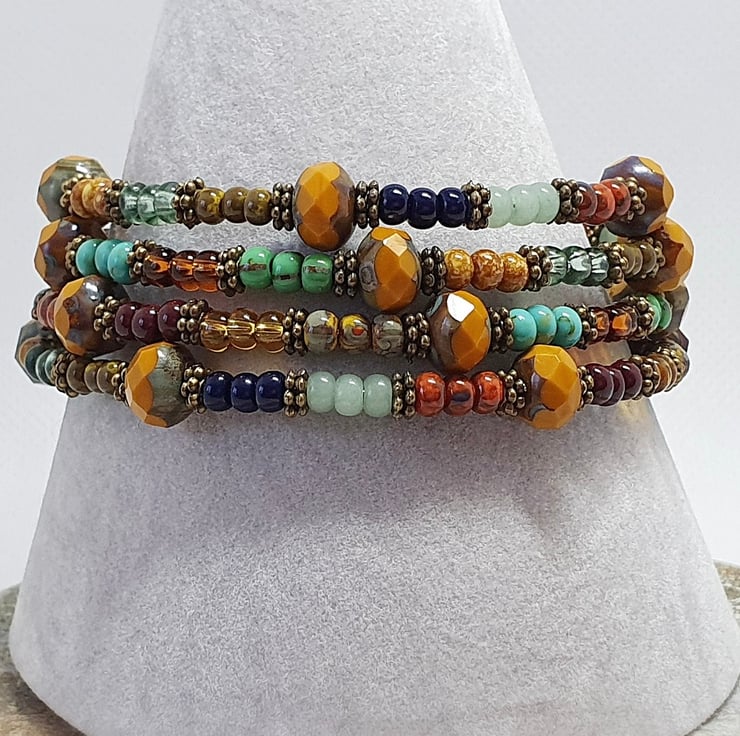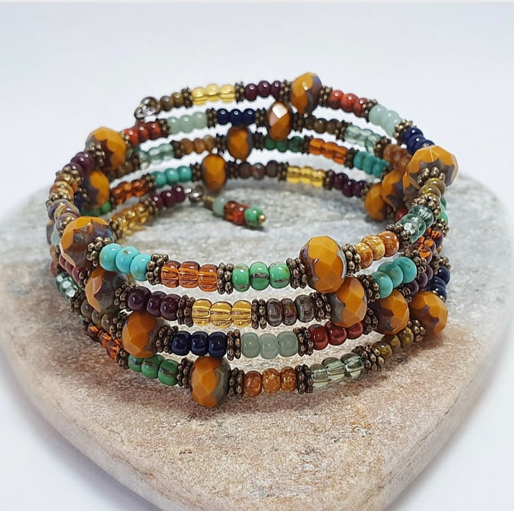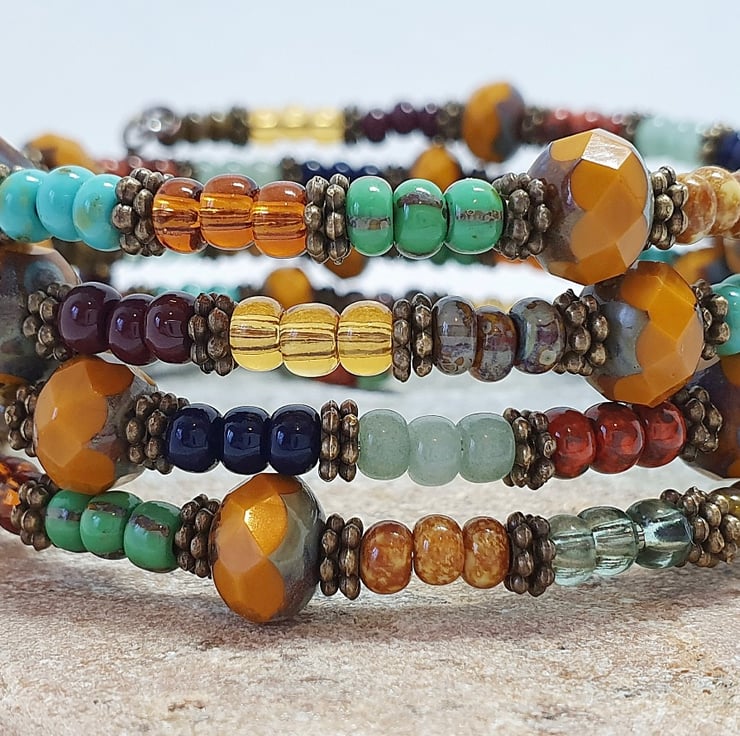 This is a colourful bracelet in deep rustic tribal colours. The main beads used for this bracelet are 4 mm Czech Preciosa Rocaille seed beads in a variety of mixed colours. Olive, citrine maroon, burnt orange, pale green, dark blue, turquoise and beige. The beads are threaded in a repeat pattern of block colours and in between are tiny bronze tone daisy spacers and beautiful 8 mm fire polished Czech beads. These beads are a deep opaque orange colour and have an aged Picasso effect to either end of the bead.
