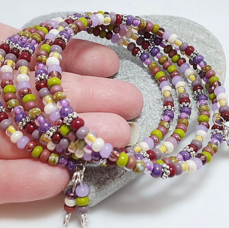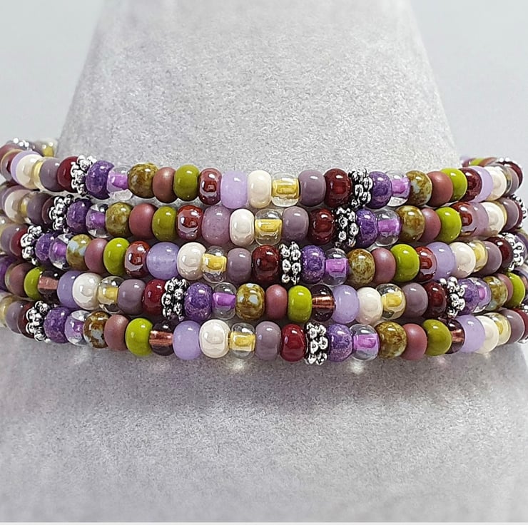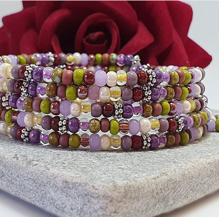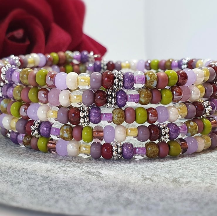 This is a boho style bracelet handmade with Czech Preciosa Rocaille seed beads. The beads are 4mm in size and are a variety of colours, dark pink, pale pink, purple, bright lilac, lime green, red, dark red, cream and bronze. The Czech beads are separated every 10 beads with 2 small antique silver tone metal daisy spacer.