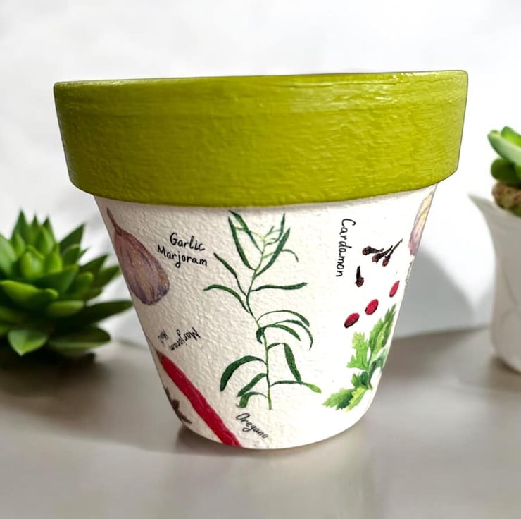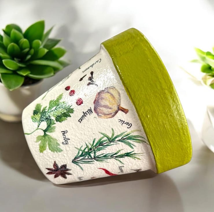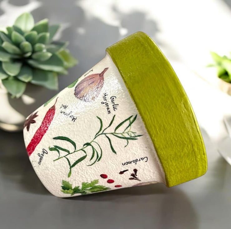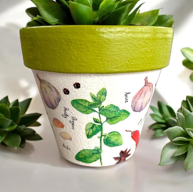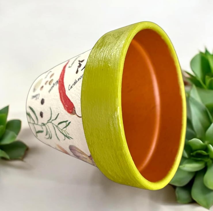 The image has been applied to a terracotta pot after being painted with Annie Sloan chalk paint using the art of Decoupage and finished a water resistant varnish.