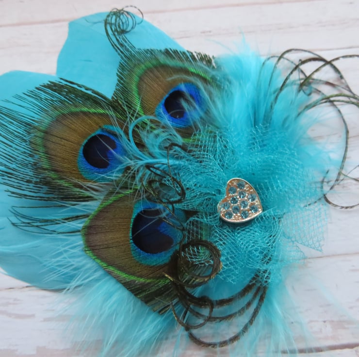 Created with shaped pale turquoise blue goose feathers, three small trimmed peacock eye feather, pale turquoise fluff feathers and curled peacock fronds and finished with a small ruffle of shimmering turquoise tulle with a small silver tone blue diamante heart stud.