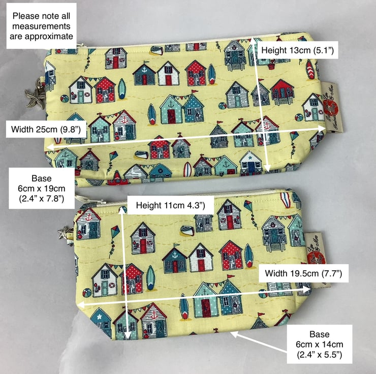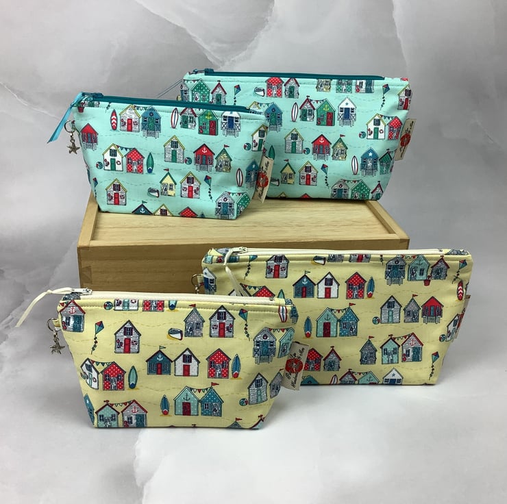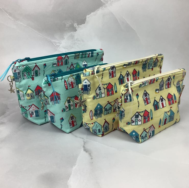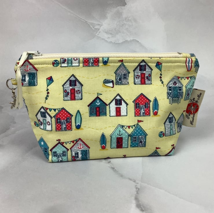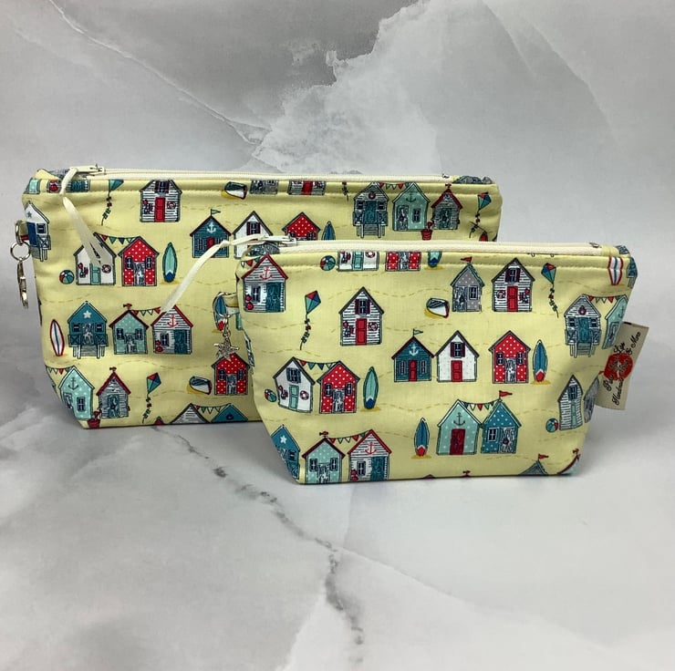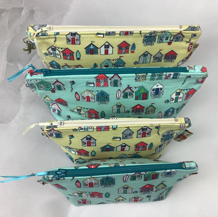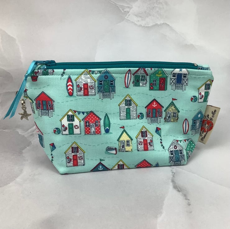 Beach huts makeup bag, Seaside zip bag, 2 size and colour options, Handmade