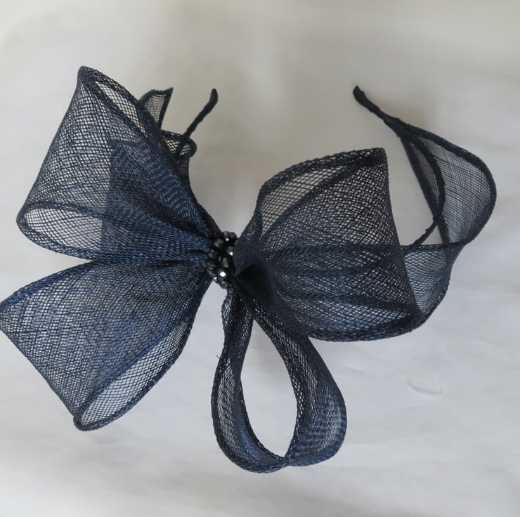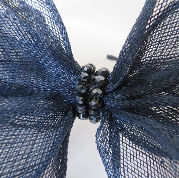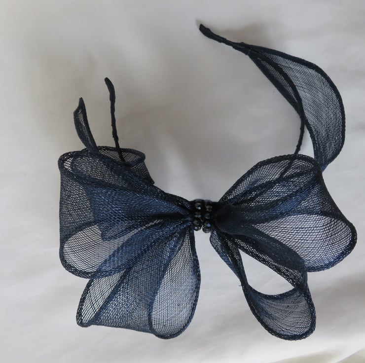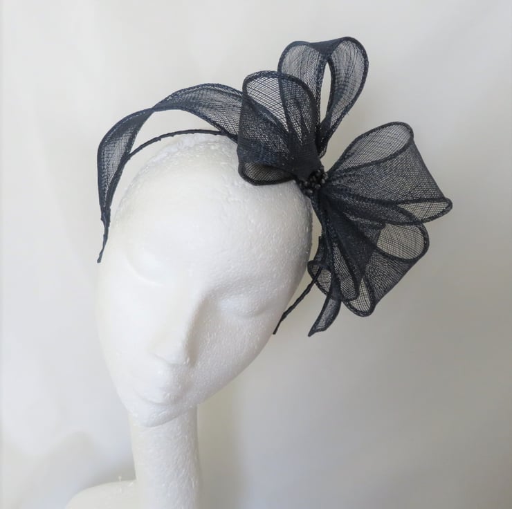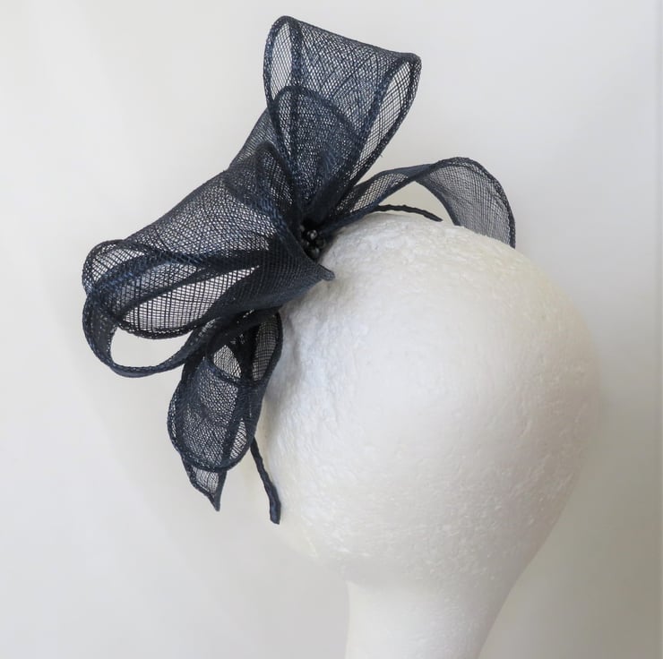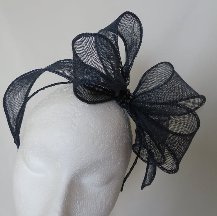 Created with a shaped piece of dark navy blue shush sinamay bias binging which is made into an oversized bow, with the trails gently swirling to the side and across the top of the head to give a halo effect.