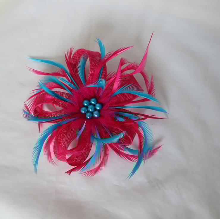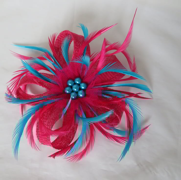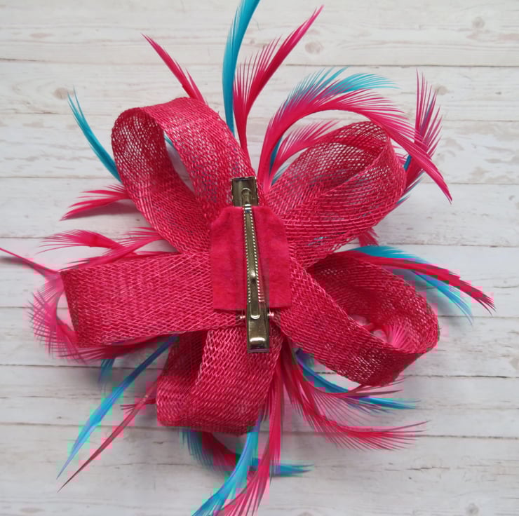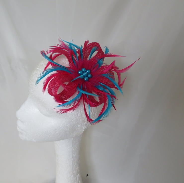 This is an attractive and eye catching sinamay loop fascinator in cerise pink and turquoise blue.