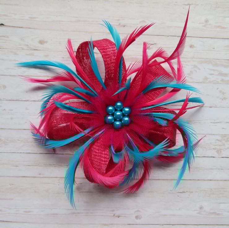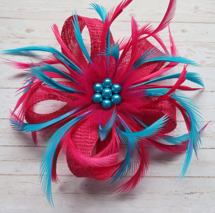 Complemented with cerise & dark turquoise blue curled biot feathers and finished with a cerise pink fine tulle ruffle, and a cluster of dark turquoise glass pearls.