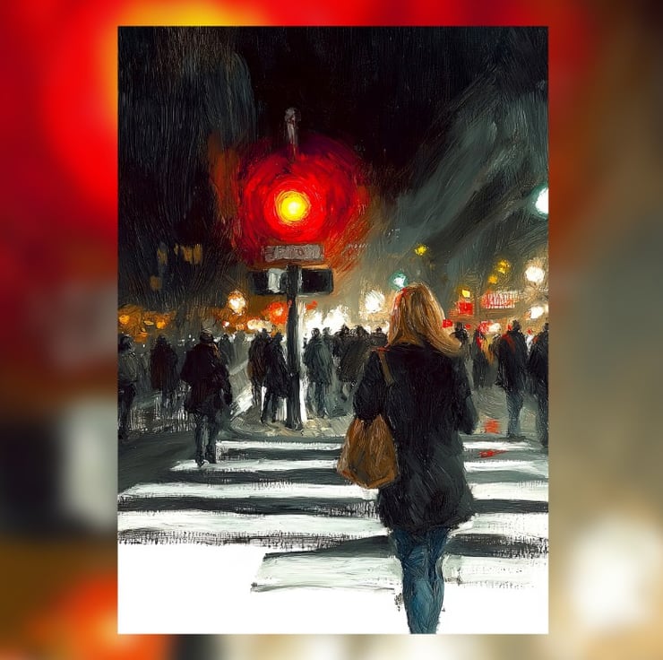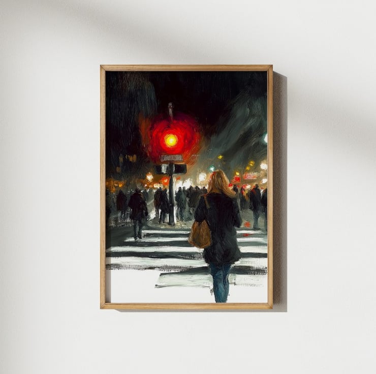 As a woman stands at a crosswalk, her silhouette glows under the red traffic light. Meanwhile, blurred figures move past her, their shapes blending into the vibrant glow of streetlights and neon signs. At the same time, the artist’s textured brushstrokes create a strong sense of movement, making the city feel alive with restless energy.
