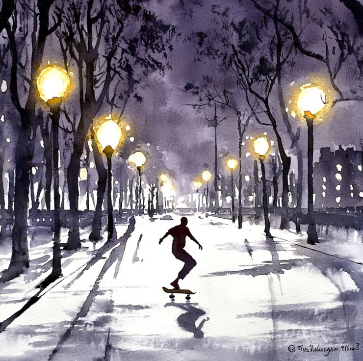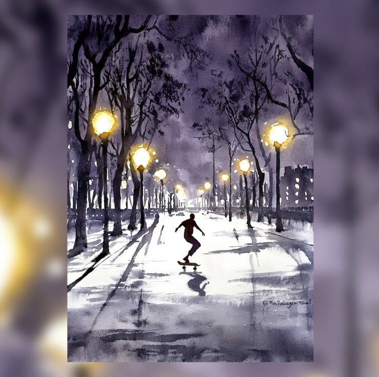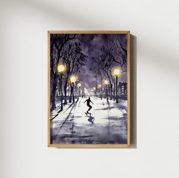 As a lone skater glides under glowing streetlights, their silhouette stands out against the wet pavement. Meanwhile, deep indigos and soft yellows blend together, creating a moody, cinematic glow. At the same time, expressive brushstrokes and the natural fluidity of watercolor bring movement and energy to the scene.