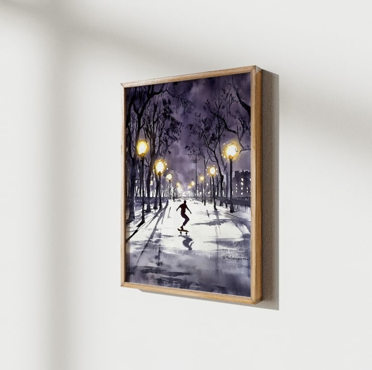 Ultimately, this artwork beautifully captures the quiet energy of late-night urban life. Perfect for those who love atmospheric and contemporary art, Night Skate brings a sense of movement, reflection, and urban charm to any space.