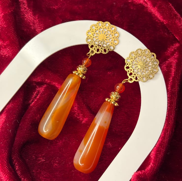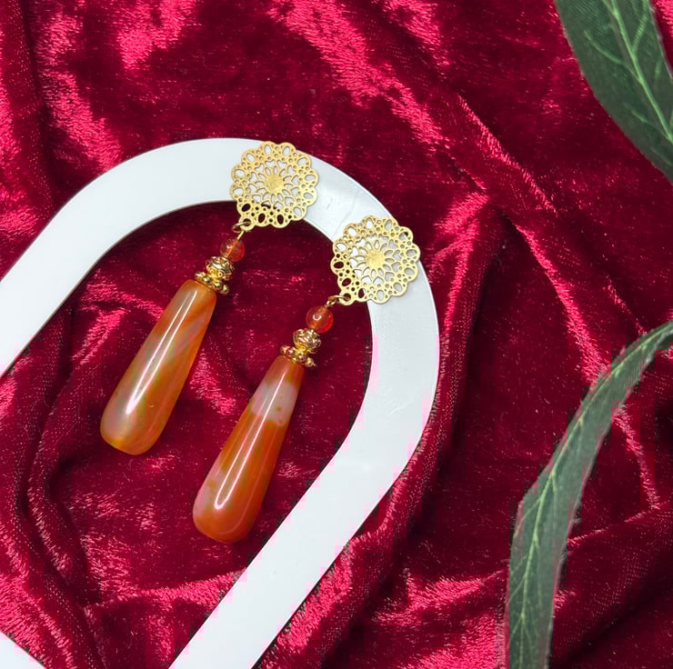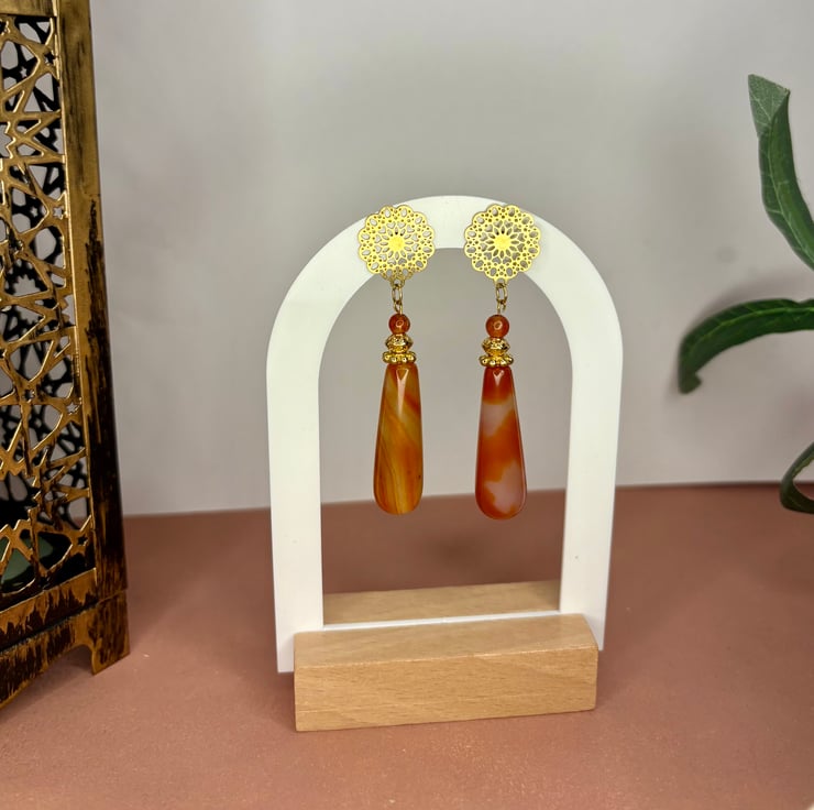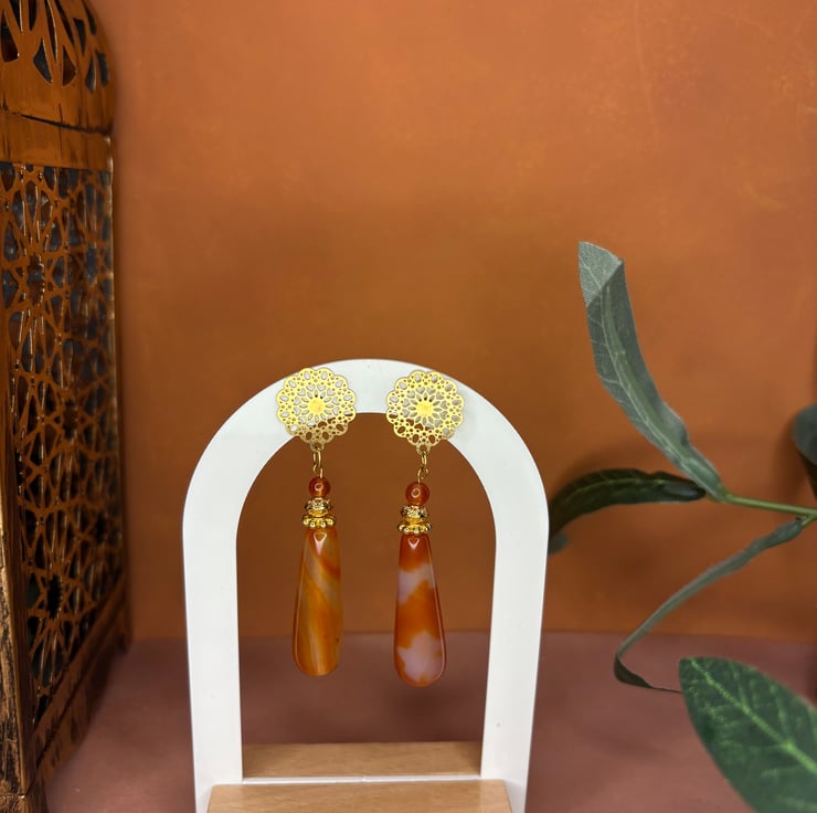 These dangling gemstone drops in warm terracotta hues capture the passion and energy of flamenco. The delicate arabesque motifs add a touch of architectural artistry, reminiscent of traditional Moorish designs.