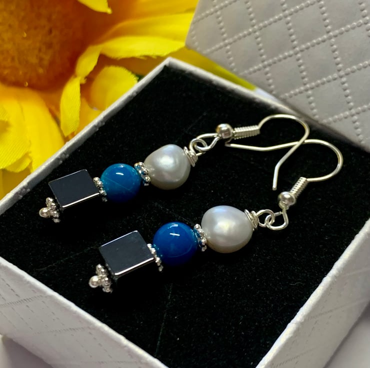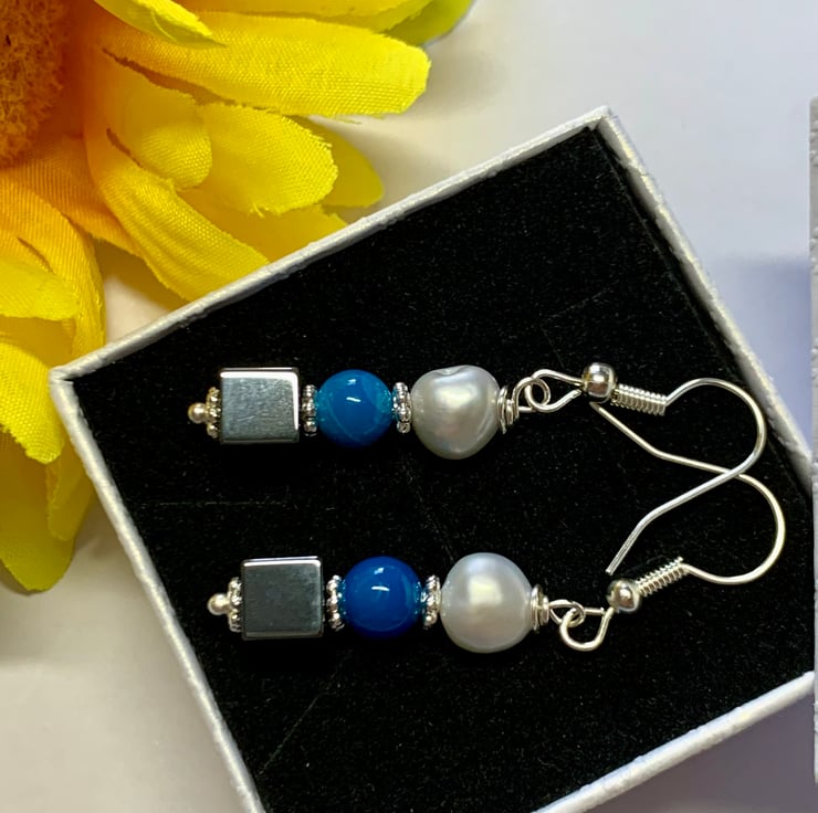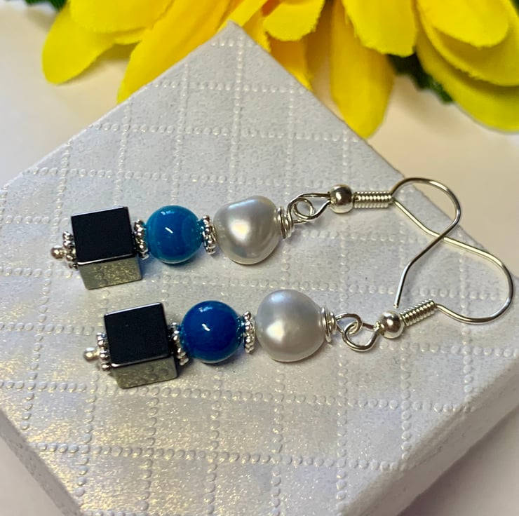 A lovely square in shape Hematite, Blue Tiger eye and gorgeous Freshwater Pearl looking beautiful against the Silver tone details for these drop earrings. These handmade, One of a kind pieces would make a lovely present for someone or make a great addition to your own Jewellery collection. They come on a Sterling Silver hook ear fitting.