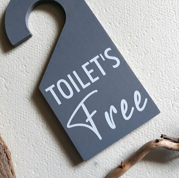 -This handcrafted, double-sided toilet door hanger is an ideal indicator of whether a bathroom is free or in use.