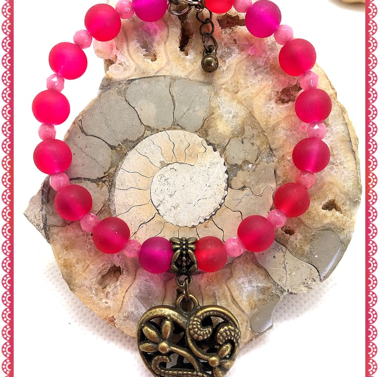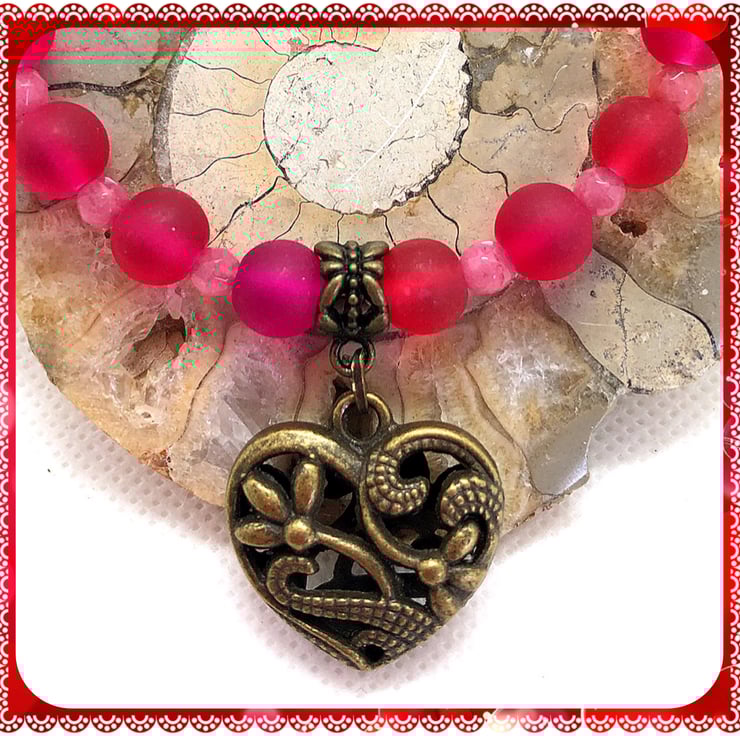 Created using this bronze puffed heart charm & bronze connector, I’ve threaded red frosted glass beads & faceted spacers onto stainless steel memory wire, lobster clasp & extension chain