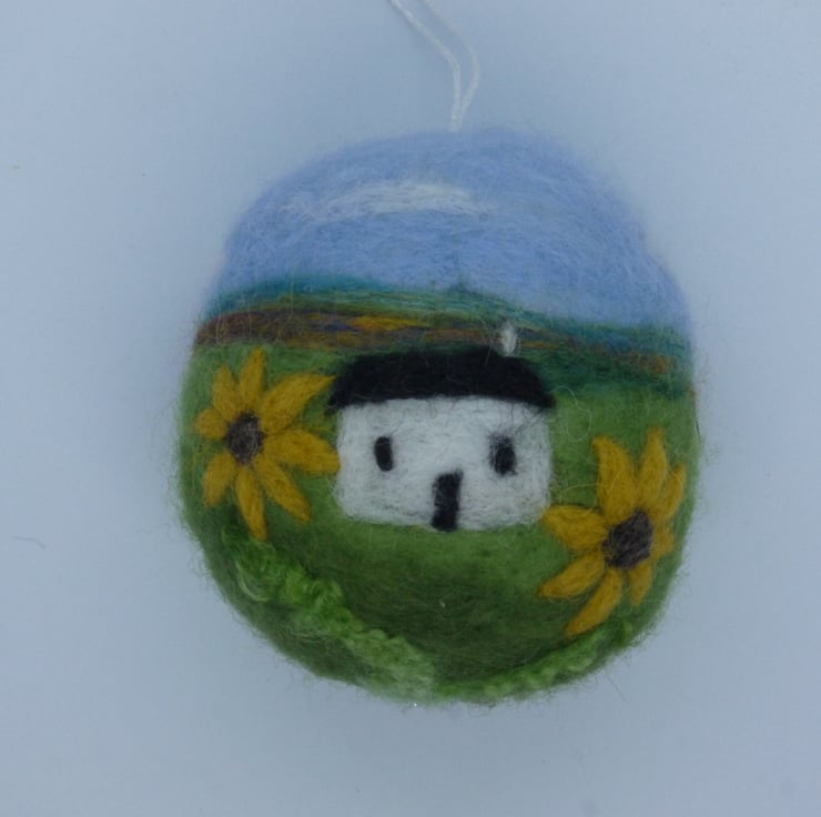 Handmade needle felted ornament decorated with a country landscape, cottage and sunflowers that comes with the gold decorative stand as in the photo. The ornament is made from 100% core wool that we then decorated with a mix of natural and dyed wools and fibres. A pretty, country landscape decorative item for any home or gift.
