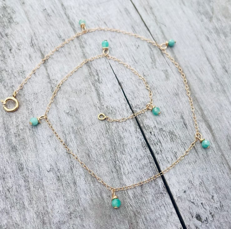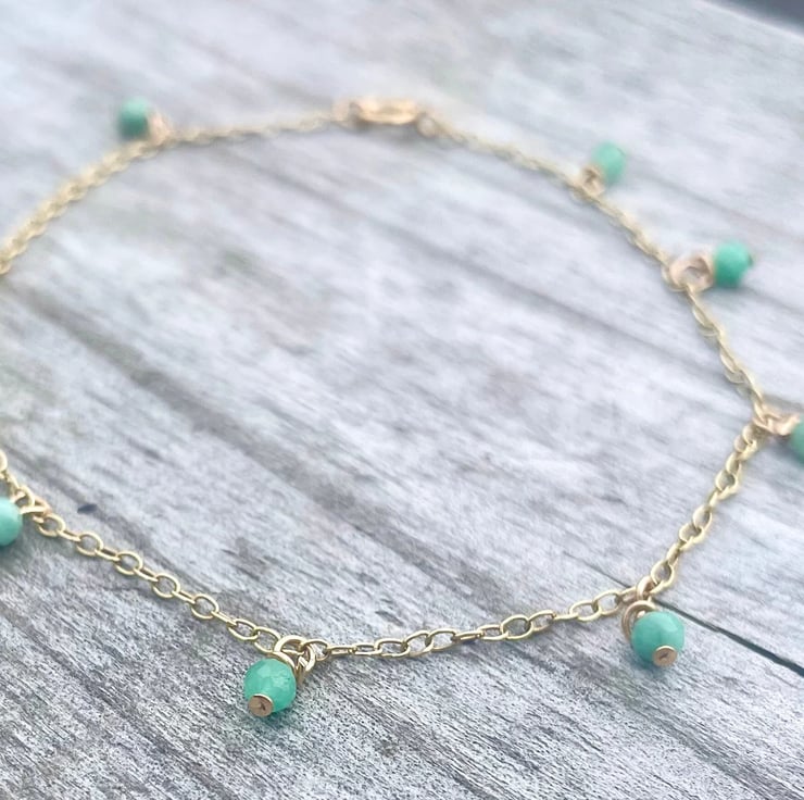 A very pretty 9ct gold cable chain bracelet, 1.8mm in width, with tiny grade a faceted natural undyed emeralds 3mm gemstomes dangling along the chain. If a different length is desired please contact me and I shall see what I can do. The chain is finished with a sterling silver spring ring and ring closure. I do make this bracelet in a 14k gold filled option, available in my shop. I also have a matching anklet and necklace. Option if sizes, 6.5 inch, 7 inches, 7.5 inches and 8 inches. Our measurements are end to end including the clasp and closing,