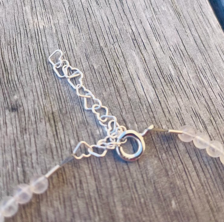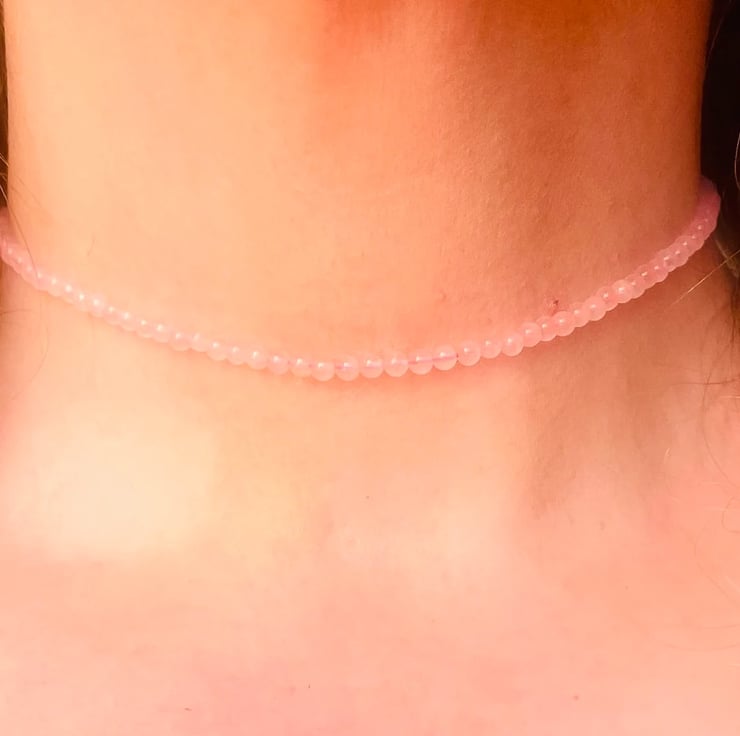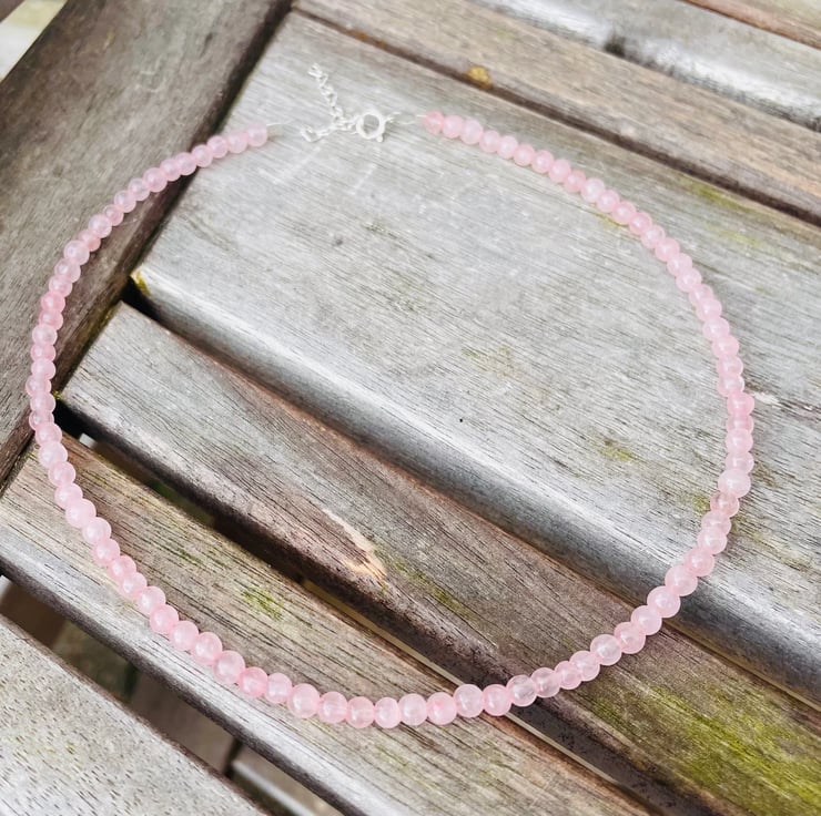 Very pretty. tiny 3mm rose quartz beads with 2 inch sterling silver heart extension chain. The gemstone necklace is 14 inches with an extra 2 inch extension chain so can be worn up to 16 inches at the largest fastening.choker necklace. Please measure your neck for a guide. Free gift pouch. Follow me on instagram RoseCJewellery to get special discount codes for my folksy shop. Thanks, Rosie.