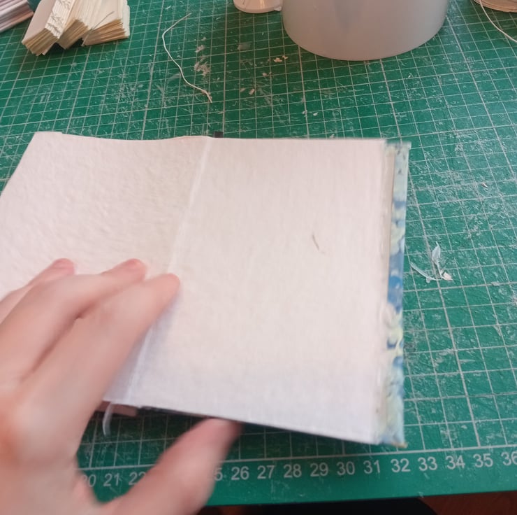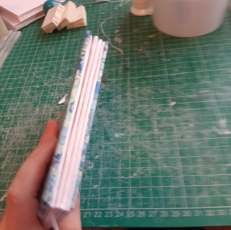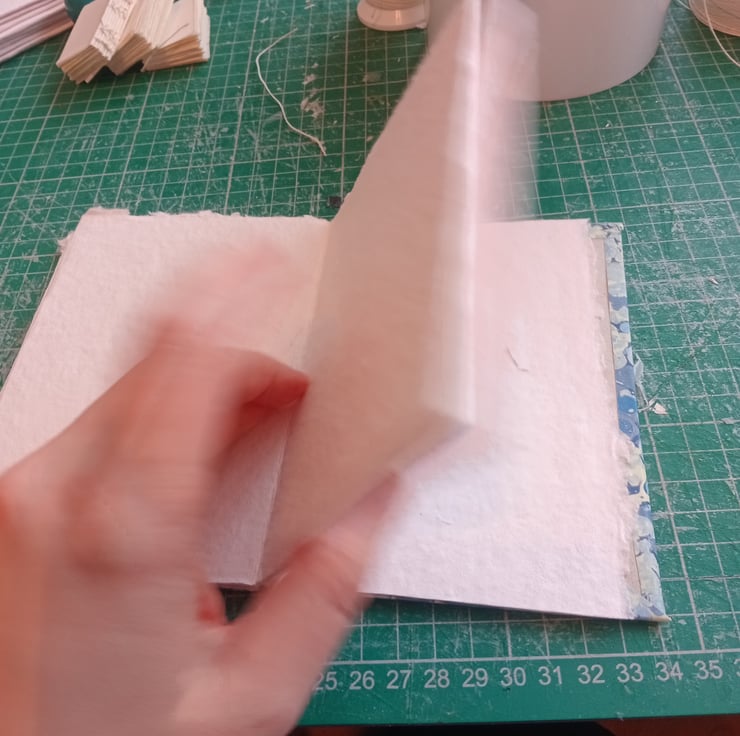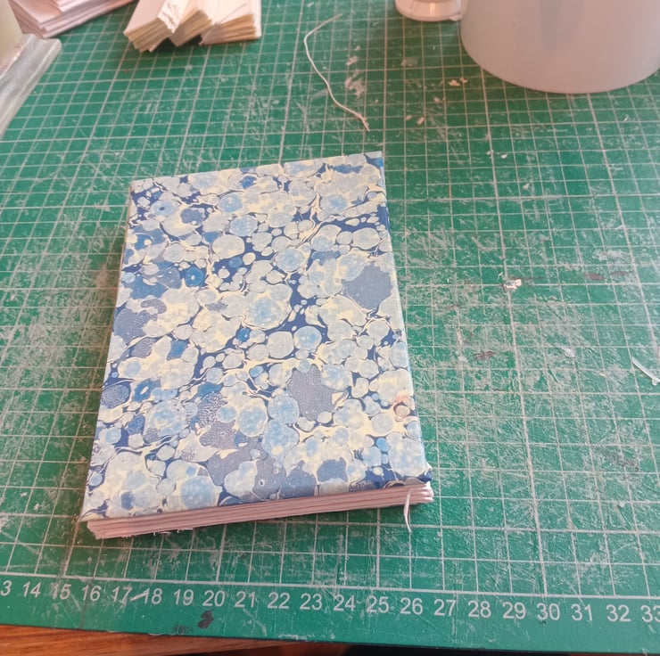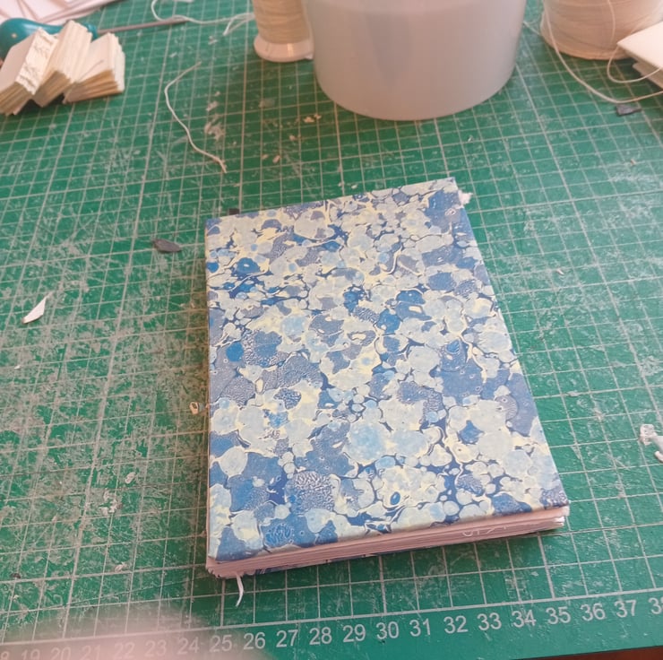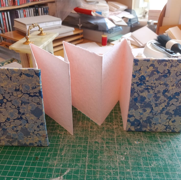 6 panels (12 sides) of indian cotton rag paper (excluding cover insides). Printed marbled design covers. Flawed on inside cover.