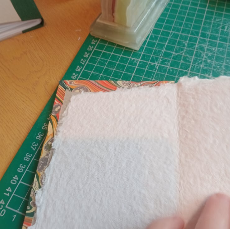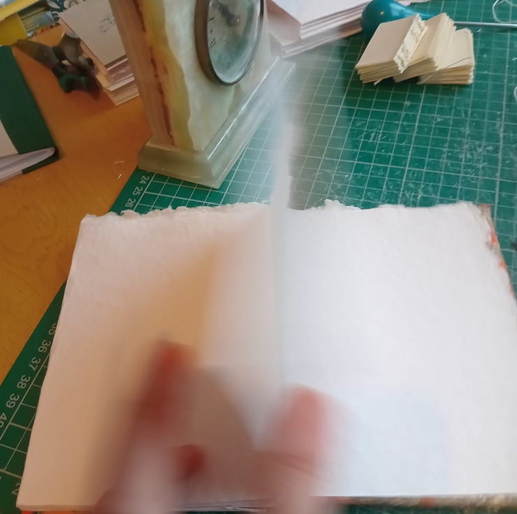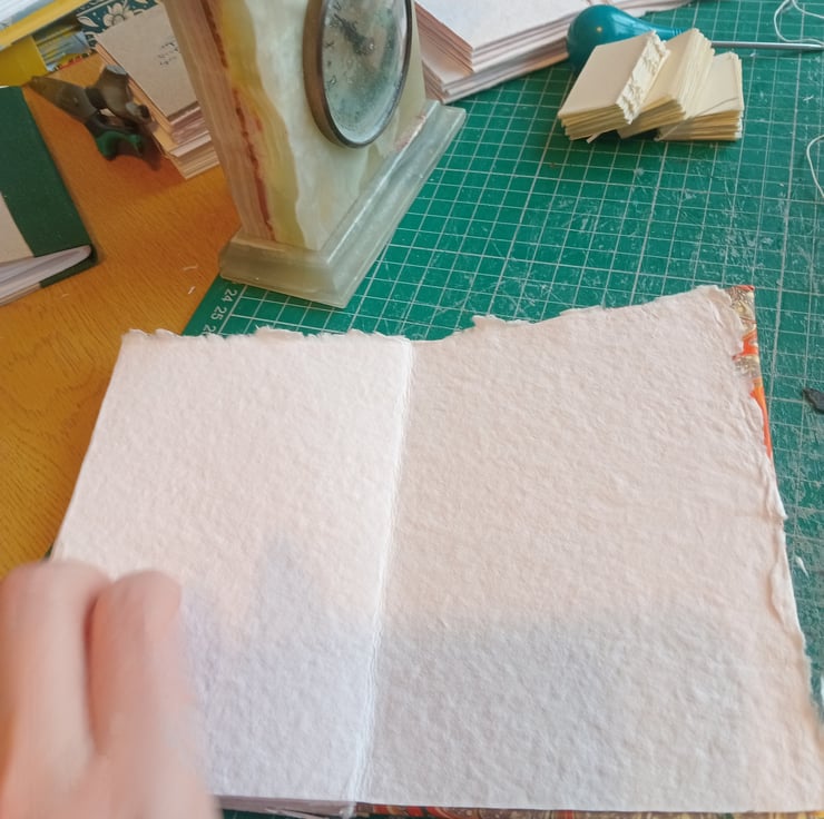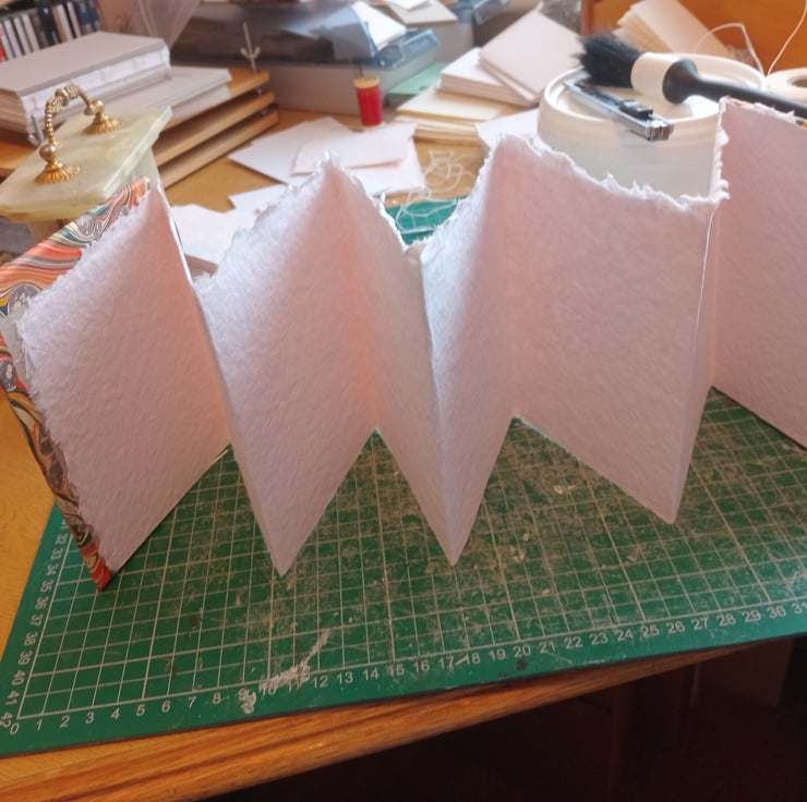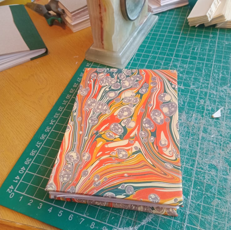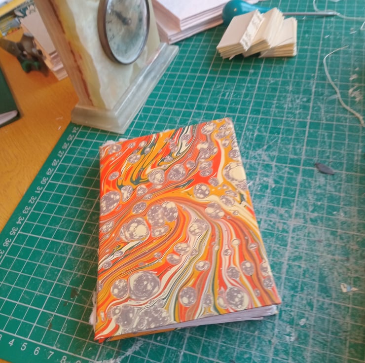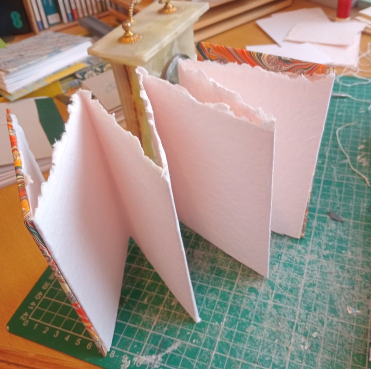 6 panels (12 sides) of indian cotton rag paper (excluding cover insides). Printed marbled design covers. Made to order