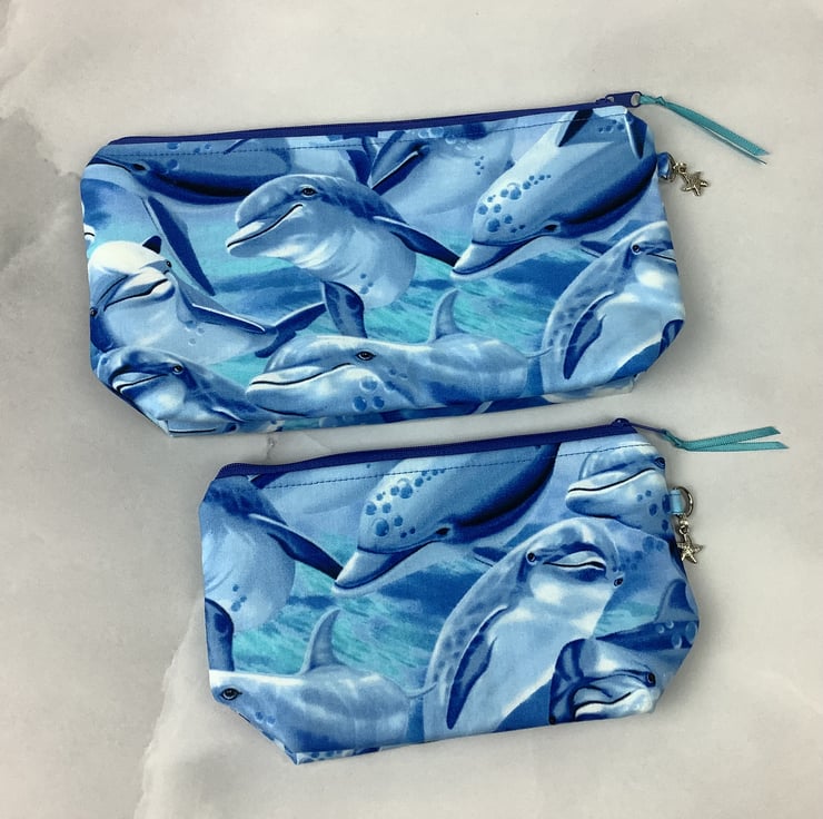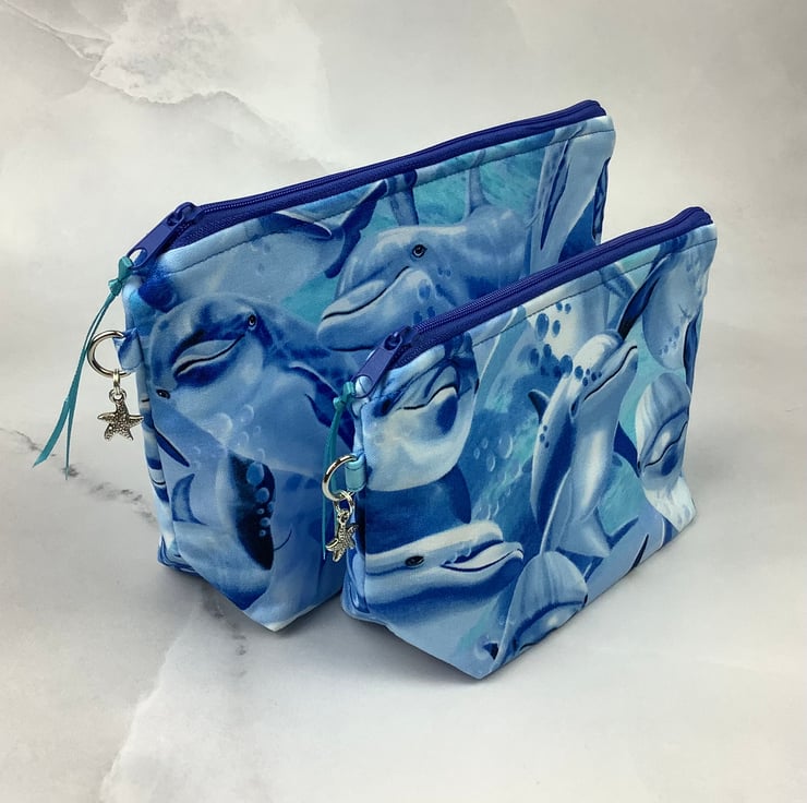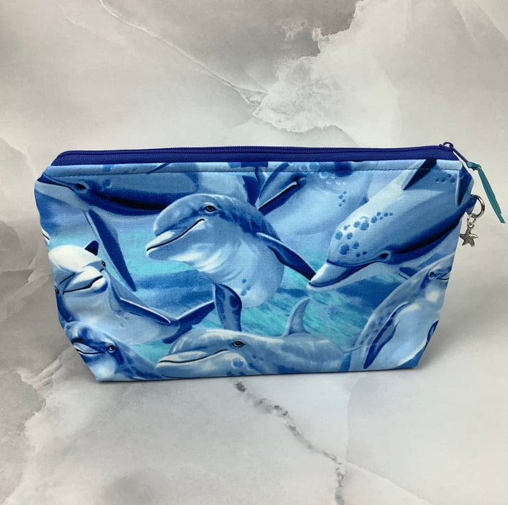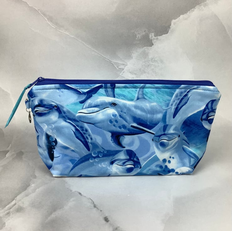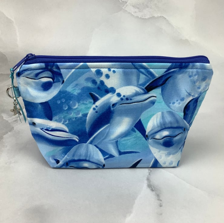 Handmade flat bottomed zip bag in a fun and playful cotton fabric, lined in blue cotton and in a choice of 2 sizes.