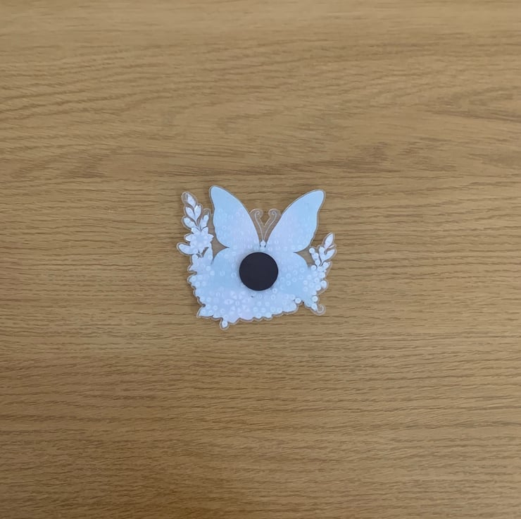 Acrylic butterfly base that has been decorated with small rhinestones & sealed with two layers of crystal art lacquer.